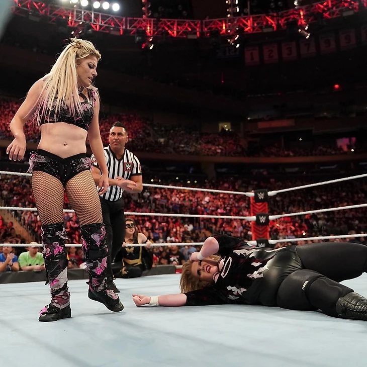 4) Алекса Блисс победила Дьюдроп. Перед матчем были хайлайты командного боя с прошлого выпуска, в котором отличились Блисс и Аска как команда. Дальше же Алекса в интервью Саре Шрайбер кратко обозначила следующее: для неё Дьюдроп уже и не такой опасный противник и что для Блисс это будет полезной разминкой. Но после этого Блисс нацелена на женское чемпионство бренда и её не волнует результат матча между Бьянкой и Бекки на SummerSlam. Не особо важный матч, который своим пафосом не обеспечил нужного общего вайба для Алексы, чего уж про Нивен говорить. Победила Алекса после попытки экс-Нивен провести свой пайлдрайвер с переводом в Tornado DDT с места (Личная оценка — 0,5). Позже стало известно, что из финальной версии вырезали сегмент при участии Нивен, Никки ЭШ и Ронду Раузи — последняя устроила разнос шотландок после промо от Нивен о неуважении к себе со стороны всех зрителей;
