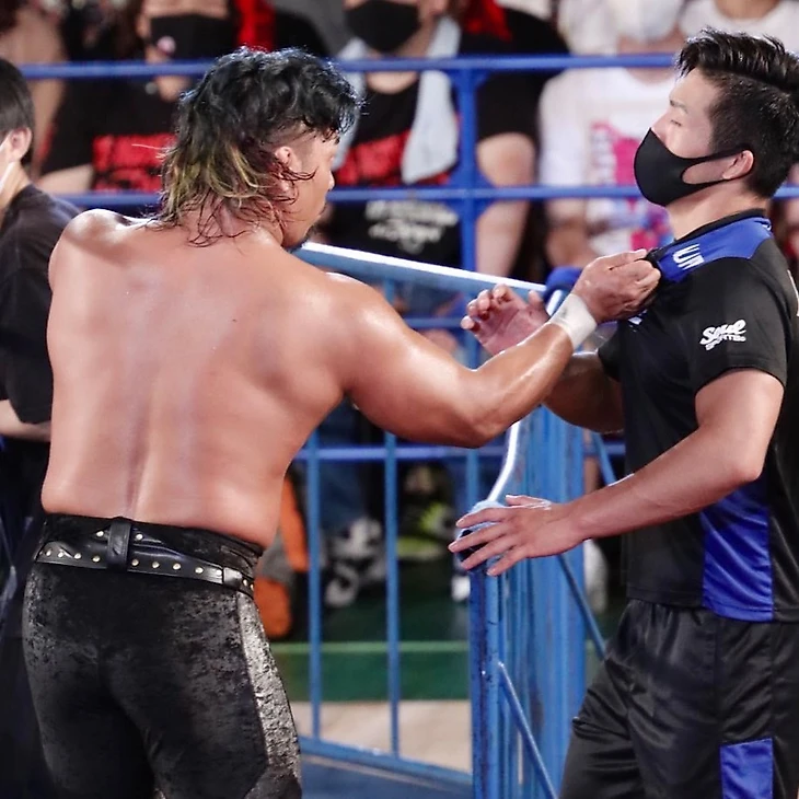 Начинается матч с чистой борьбы. Медленновато, на мой вкус, на настоящем ковре с такой скоростью долго время не проводят, но все же. Хил и твиннер, близкий к хилу, проводят начальный отрезок матча в чистой борьбе с чистыми брэйками. Прошло уже 5 минут матча, а чистая борьба продолжается. Никто не получает серьезного преимущества, и в итоге САНАДА решил-таки провести спрингборд дропкик и планчу. Для ТКО еще рано, О-Хан хватает в клатч… тело? САНАДЫ, выбивает колено соперника и обрабатывает им угол ринга, после чего отвечает на дропкик САНАДЫ лариатом. Монгольские чопы, призывает САНАДУ встать и разменяться ударами О-Хан, САНАДА принимает вызов. Очередной удар ниже пояса в падении от САНАДЫ, сворачивание, ТКО, но мунсолт попадает на колени О-Хана. Колено О-Хана сдает, но он успевает сбить с третьего каната САНАДУ, бэкбрэйкер, шип киллер, но за косу утаскивает себя из захвата САНАДЫ, скалл энд не проходит, элиминэйтор тоже, скалл энд, хватает за лицо соперника О-Хан, Рэд Шуз недоволен (я искренне не понимаю, чем. Да, у САНАДЫ была травма глаза, но что теперь, О-Хану финишер не проводить. Даже сам О-Хан в этот момент сказал Рэд Шузу, что он так каждый матч делает, это его финишер), в результате О-Хан даже отпустил захват и переговорил с судьей, но нападение от САНАДЫ прерывает судьей О-Хан и удар прямой правой. Мунсолт от О-Хана!!! До двух, САНАДА отбивается, поп ап ТКО, мунсолт.