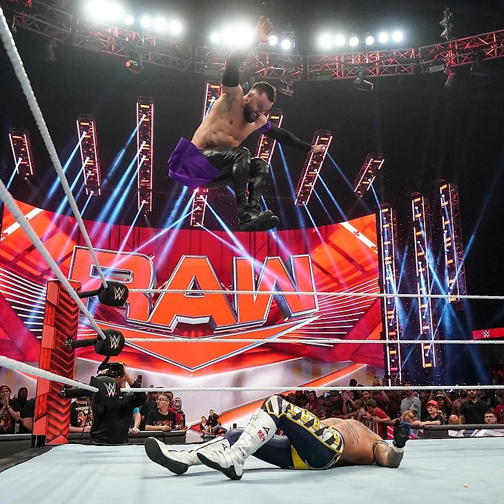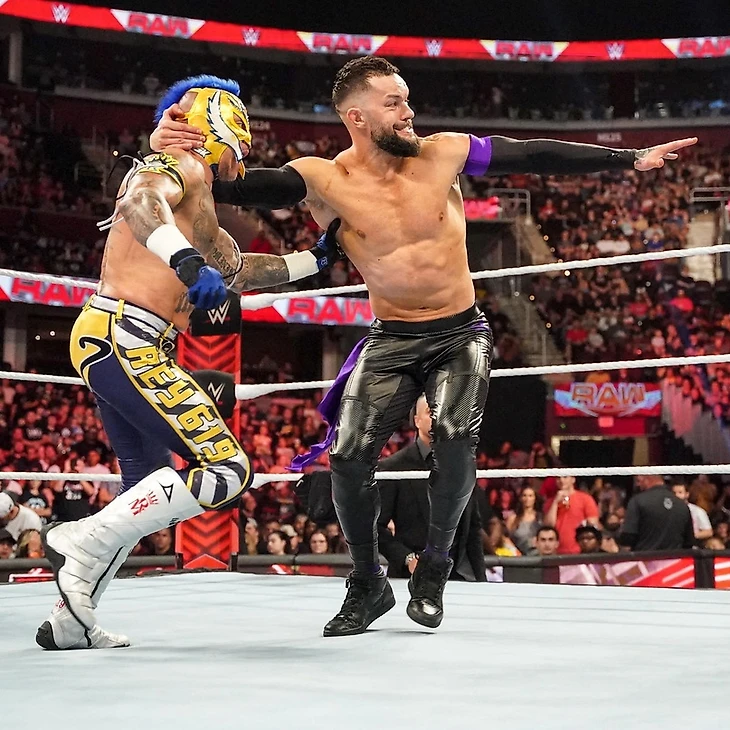 Матч начался, и Финн очень быстро захватил контроль, нанеся несколько неприятных ударов. Получив чоп, Рей реверсировал запуск в угол, проведя несколько собственных ударов и впечатав оппонента лицом в верхний тернбакл. Балор попробовал отбиться, получил харриканрану и отправился за пределы ринга, где его ждали бейсбол слайд и seated senton с апрона. Возвращаясь в четырехугольник, Мистерио забрался на угол и провел seated senton с третьего каната, направив недруга затем лицом в тернбакл харриканраной. В какой-то момент ирландец сумел увернуться от спрингборд кроссбади, зарядив кик по корпусу. Он провел еще несколько не совсем чистых атак, пока не попал под сансет флип до 2. Final Cut позволил Финну вернуть контроль в свои руки. Он зашел на Three Amigos, но третий суплекс Рей перевел в собственный бросок. Еще одна серия страйков от лучадора последовала, и Финн попытался выйти на сансет флип, но получил дропкик в голову до 2. Получив несколько ударов в углу, Балор попал еще и под «мексиканский» бульдог, но вновь лишь до 2. Тогда Рей подготовил соперника к 619, но Прист спас товарища от этого дела, получив 619 в затылок. Балор же воспользовался этим, направив визави в рингпост с апрона, и мы ушли на рекламу.