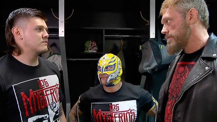 Нам напомнили, как на прошлом шоу Эдж обещал прикончить Judgement Day, после чего Доминика Мистерио подставили под гарпун. Теперь Эдж пришел в раздевалку говорящих о грядущем матче Доминика Мистерио, извинился за прошлую неделю и сказал, что он прикроет Мистерио в случае чего. «Без обид?» — спросил Эдж. «Без обид!» — ответил Дом, толкнув канадца. Рей стал успокаивать сына, сказав, что неделю назад это была случайность, он знает Эджа 20 лет, и может считать его семьей. «Меня ты знаешь 25» — ответил Доминик. Он поверить не мог, что отец занимает в этой ситуации сторону Эджа. Дом покинул раздевалку, а Рей сказал Эджу, что поговорит с сыном и все будет нормально.