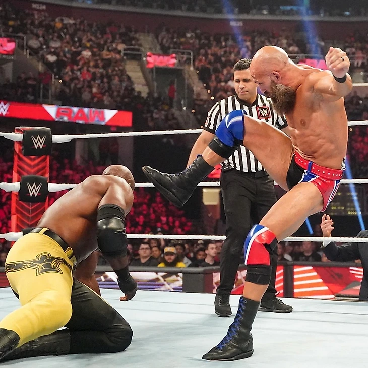 Перед матчем нам показали по-хорошему пафосное видео об истории чемпионства. Миз сопровождал Томмасо к рингу. Сразу после гонга Том стал забивать оппонента, но Бобби поймал его шоулдер тэклом. Вертикальный суплекс с задержкой последовал, и Лэшли плотно захватил контроль. Уйдя от попытки реверса Тез Пресса в пауэрслэм, Чиампа провел чоп блок, но чувствовать чопы чемпион отказался, зарядив бэк элбоу. От гарпуна Томмасо ушел за пределы ринга и переговорил с Мизом. После этого Майк поднялся на апрон, чтобы отвлечь «Всемогущего», но Боб догадался, что грядет атака со спины, поэтому врезал Томмасо, который уже был готов провести эту самую атаку со спины. Лэшли приготовил противника ко встрече со стойкой ринга, но Миз воспротивился этому, встав на пути у чемпиона… и тогда Бобби послал Тома в полет на Миза, отправив шоу на рекламу. Вернувшись, мы увидели, что претендент доминирует. Отбившись от слипера, Лэшли провел связку из шоулдер тэкла, лэриэта и мини-гарпуна в углу, добавив еще пару атак. Следующий забег в угол Томмасо встретил бутом, получив коронный слэм, но только до 2. От пауэрслэма Чиампа ушел, шарахнув реверс DDT, но только до 2. Не сумев совершить камбэк, Бобби получил еще один DDT, снова до 2, после чего реверсировал Fairytale Ending, шарахнув гарпун.