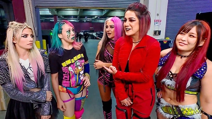 Однако Бэйли никого не винит в потере этого самого «спортивного голода». Просто она была вынуждена уйти на лечение, и это дивизион чувствовал себя покинутым, никто не знал, что делать, как попытаться добиться большего без Бэйли. Но Бэйли всегда считала, что если ты не можешь получить ответы, значит нужно задать более правильные вопросы, и у нее есть вопрос к нам - идиотам. Как так получилось, что она оказалась единственным человеком, понимающим, насколько опасным оружием может быть ИЙО СКАЙ? Как так получилось, что только Бэйли видела преимущества того, чтобы привести в компанию Дакоту Скай? Бэйли оговорилась, сама поправила себя, конечно же, Дакота Кай, просто фанаты своим гулом ей думать мешают. Аудитория злит Бэйли, но могут ли фанаты представить, насколько злы должны быть ИЙО и Дакота… в общем, Бэйли вышла на эмоции, и Кай пришлось даже ее успокаивать. Бэйли не должна ничего доказывать фанатам, ей нужно успокоиться… Дакота же сказала, что они с ИЙО все докажут, когда сегодня примут участие в матче турнира за командные титулы, и… выход Алексы Блисс прервал ее. Естественно, Блисс в родном штате встретили тепло. Но Алекса не одна, с ней Аска. И женская чемпионка Бьянка Белэйр. Блисс предложила СКАЙ и Кай не спешить сильно. Ведь они не выиграют турнир за женское парные пояса. Почему?