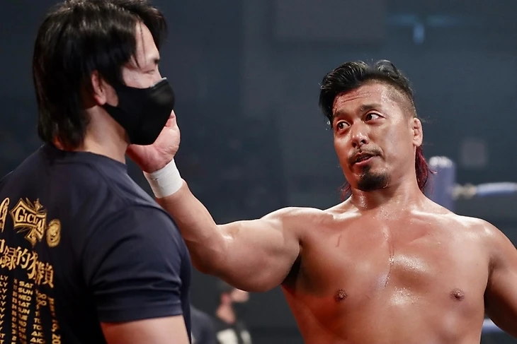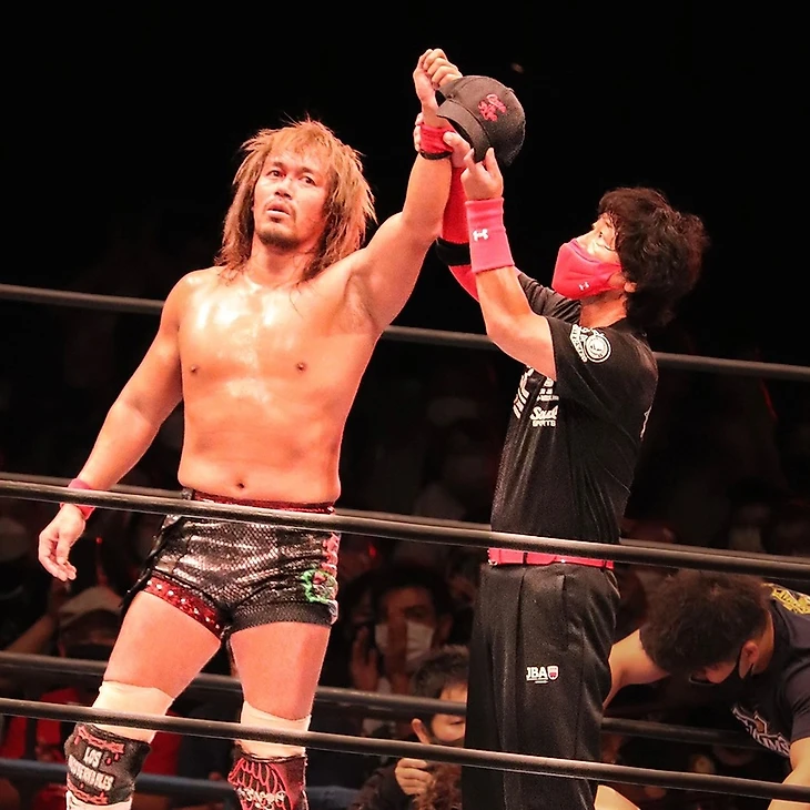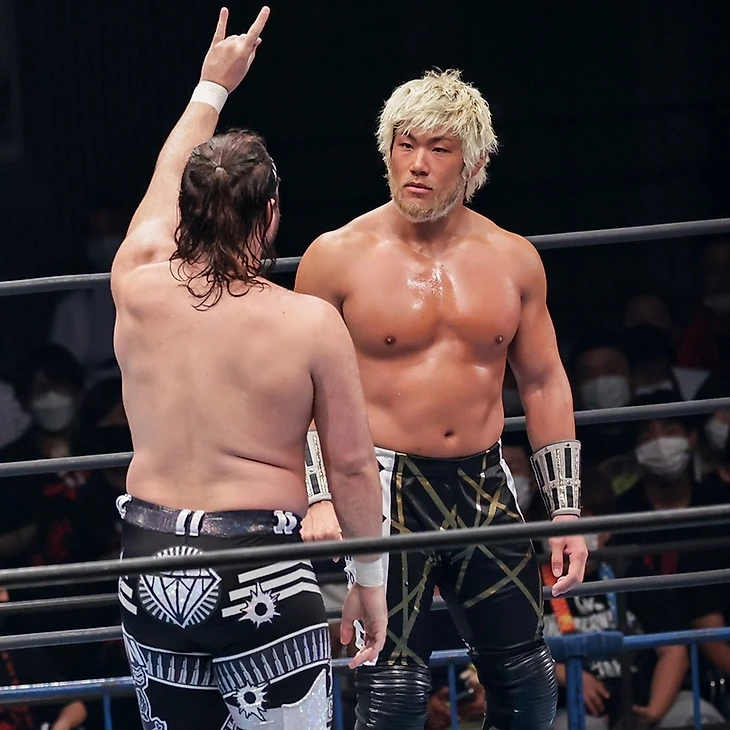 Эти двое лишь дважды встречались ранее в одиночных баталиях. В феврале 2020 КЕНТА проиграл в матче за двойное чемпионство на последнем PPV перед пандемией, но победил на G1 Climax 30 осенью того же года. Предсказуемо представитель Bullet Club не спешил начинать матч, прячась в канатах. Когда же он захотел, уже Найто стал сбивать настрой визави. КЕНТА попытался атаковать, но попал под армдрэг, который послал его за пределы ринга, чтобы порадовать зрителей Tranquilo Pose. КЕНТА вернулся в четырехугольник, атаковал глаза соперника и отправил за пределы ринга уже Тетсую… чтобы тоже лечь в ринге в позу, напоминающую коронную позу БУШИ. Найто за это вытащил его на рингсайд и отправил в баррикаду. Оказавшись рядом с тайм-кипером, КЕНТА схватил молоток и ударил им в голову соперника, а судья это как-то проморгал. Атаковав оппонента еще и микрофоном, КЕНТА жестко запустил его в ограждение, и действие вернулось в ринг. Удержание до 2, и КЕНТА стал развивать завоеванный контроль, снял тернбакл с угла и запустил в этот самый угол Найто. Помучившись еще немного, Найто улучил момент для некбрейкера. Combinacion Cabron, еще один некбрейкер, и Тетсуя провел болевой, завершившийся роуп-брейком. Затем КЕНТА поймал его коронным пауэрслэмом, прибавив к нему hot shot и клоузлайн с третьего каната до 2. STF, и Тетсуя спасся, схватившись за канат, за что получил DDT.