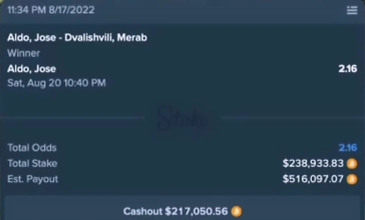 Первая ставка – 238 тысяч долларов на Жозе Альдо в бою с Мерабом Двалишвили.