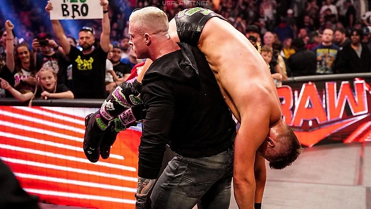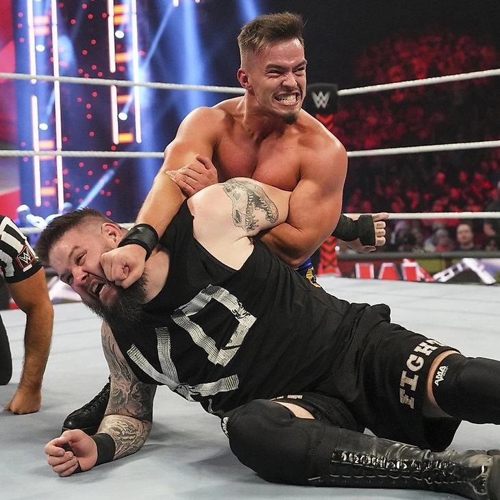 Тиори вышел на ринг, чтобы сказать, что в субботу ему не получилось выполнить задуманное, однако Crown Jewel был большим успехом… Остин пошутил, Clash at the Castle, конечно. Тиори уверен, что фанаты хотели бы увидеть его неудачный кэш-ин, однако он все еще стоит на ринге в статусе «Мистера Money in the Bank», а значит является будущим неоспоримым чемпионом. Все время, что рестлер говорил, он испытывал проблемы с челюстью после правого прямого Тайсона Фьюри на стадионе в Кардиффе. Разница между Тиори и фанатами в том, что после того, как его отправляют в нокдаун он всегда встает. Даже если в нокдаун его отправил удар исподтишка от чемпиона мира по боксу. Все это не имеет значение, потому что Роман Рейнс все еще чемпион. Однако, так даже лучше. Во-первых, потому что МакИнтайр опозорил себя на глазах своих соотечественников, друзей и семьи. А во-вторых, потому что у Остина и Романа есть неоконченное дело. Вскоре Тиори закэшит и станет новым неоспоримым чемпионом Вселенной. Он запнулся на этой фразе, но схватился за челюсть и упрекнул фанатов, мол из-за их гула она болит еще сильней. И тут заиграла музыкальная тема Кевина Оуэнса. Его встретили тепло. Кев спросил, что не так с челюстью Тиори, а потом вспомнил, что его отправили в глубокий нокаут. Остин предложил еще один термин «You got KOed!», что публика сразу подхватила. Кевин kind of извинился за первую игру слов, которая пришла к нему в голову, обратился к Тиори по фамилии… а потом вспомнил, что тот нашел свое имя, поэтому Оуэнс может обращаться к нему как к «Остину». Канадец добавил, что больше всего в индустрии ненавидит нахальных людей и людей, которые живут в какой-то своей реальности. До Тиори таких было много, много будет после, но сейчас Тиори - самый яркий пример всего, что ненавидит Кевин. Остин настолько не отдает отчет в том, что происходит вокруг него, что винит Фьюри в срыве кэш-ина, хотя если бы Тайсон не помешал бы закэшить, то либо Роман, либо Дрю вырубили бы его, и Тиори лишился бы своего шанса, так что «Цыганский Король» в каком-то смысле оказал Остину услугу. Тиори не согласился с ним, Оуэнс не понимает, о чем говорит. Кев просто завидует.