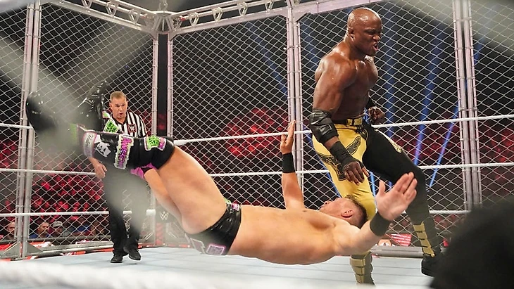 Матч еще не начался, а Миз отобрал у рефери пояс чемпиона и заехал им в затылок «Всемогущего». Выкинув его из клетки (что не засчитывается как победа Бобби, ибо матч официально еще не начался), Майк избил его, в чем претенденту помог Томмасо. Лэшли был даже запущен головой в стену клетки с внешней стороны, а потом еще раз. Удар ступеньками по руке у угла клетки последовал. Почему Лэшли не сопротивлялся? Потому что Том держал его. RAW ушло на рекламу, а Миз и Чиампа продолжили работать над рукой чемпиона, пока матч так и не начался. Еще и удар стулом последовал, Том побил Лэшли у барикады и добавил колено с разбега. Наконец Боба вернули в четырехугольник, матч официально начался, Миз сразу провел удержание, но только до 2. Майк добавил биг бут, но только до 2. Тогда «Эй-Листер» попытался выбраться из клетки, но Лэшли остановил это дело и вырубил оппонента. Затем Бобби понял, что выбраться из клетки ему помешает травма руки, поэтому решил еще поработать над соперником, но суплекс не удался из-за все тех же проблем с рукой, и Миз атаковал эту самую руку, проведя серию IT! Kicks, добавив контрольный в руку, но только до 2. Майк почти вышел из клетки через дверь, но «Всемогущий» опять его остановил, затем прервал еще одну попытку бегства, усадив Миза на канаты причинным местом.