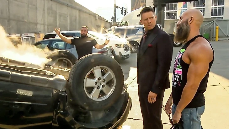 «Ранее сегодня» Миз и Томмасо Чиампа разговаривали о чем-то по пути с парковки, когда Сара Шрайбер решила взять интервью у Майка. Например о том, как Миз доехал до отеля на прошлой неделе, имея кое-кого в своем багажнике. Миз сказал, что не хочет об этом говорить, он после того RAW вернулся в отель, быстро собрал вещи и улетел домой, откуда отправился в отпуск с женой. Остальное он обсуждать не будет. Сара решила спросить о матче в клетке с Лэшли, упомянув Дестера, после чего Том сразу ее прервал. Она ведет себя слишком по-журналистски, пытаясь создать драму на пустом месте. А между прочем в сложившейся ситуации именно Миз является жертвой. Майк упрекнул репортершу в том, что она всегда задает кучу вопросов, но ни разу не спросила как у него дела. «Как у тебя дела?» - спросила Шрайбер. «Это не твое дело!» - ответил Миз, добавив, что двигается дальше по жизни и с оптимизмом смотрит на свой бой с Лэшли сегодня. А потом они увидели перевернутую машину.
