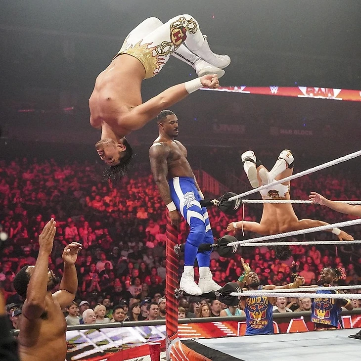 У нас классические правила, когда 2 рестлера от 2 команд борются на ринге, пока остальные команды ждут возможности забрать у них тэг. Начали бой Вудс и Энджел. Они выдали стартовую классику, обменялись безрезультатными сворачиваниями и увернулись от киков друг друга. Гарза сорвал с себя трико, бросил их в оппонента, а потом передал тэг Кофи. Оказывается, это правилами не запрещено. В общем, 2 представителя Нового Дня оказались «легальными» рестлерами, пожали руки… и Кофи лег, чтобы напарник его удержал. В такой ситуации победит Новый День, хотя проиграет тоже Новый День. И такое возможно, оказывается, согласно правилам. Естественно, остальные 6 человек рванули разрывать удержание, что привело к массовой драке. Вудс и Кингстон отправили всех за пределы ринга и полетели на остальных дайвами через третий канат. Вернувшись с рекламы, мы увидели, что Умберто мучает Форда в захвате. Тот попытался отбиться, но тщетно. Бэк суплекс от Умберто, затем он атаковал Новый День, увернулся от энзигури, но Тез отбился ап киком. но Гейбл забрал право ведения боя у Умберто, не позволив Монтезу передать тэг. Мексиканец почему-то присоединился к их борьбе, и Чэд увернулся от энзигури, который наконец достиг головы представителя Los Lotharios, после чего «горячий» тэг получил Анджело. Тот уничтожил Гейбла коронными страйками, нейтрализовал на всякий случай Отиса, а Умберто, поспешивший в четырехугольник получил buttefly bladebuster.