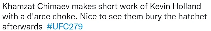 «Хамзат Чимаев быстро расправился с Кевином Холландом удушающим приемом. Приятно видеть, как они потом закопали топор войны»