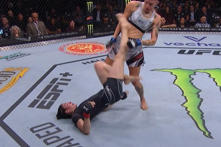 Ирэн Алдана в третьем женском поединке за вечер победила необычным приёмом. Ну, то есть довольно редким. Она нокаутировала Мэйси Чиассон ударом ноги в печень из положения лёжа!