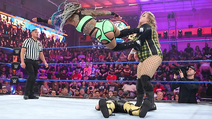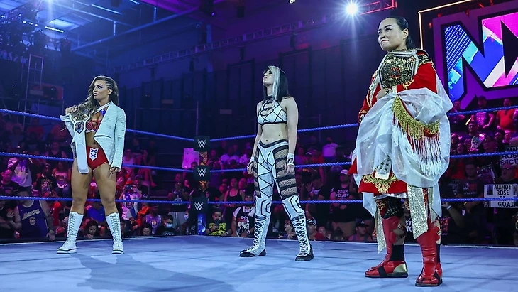 Сатомура, конечно, величайшая. По ходу матча казалось, что это все-таки больше про Дэйвенпорт и Роуз, а не про Мейко, но она была «клеем», который соединял все это воедино, причем бой получился хорошим, пусть и не классикой на века, и мне особенно нравится, что Блэйр использует вариацию Kamigoye, ибо мне хочется верить, что это отсылка на противостояние Коты Ибуши и Уилла Оспрея в NJPW. Тогда Уилл провел Би Каттер, дав понять, что он не дорожит ничем и никем, кроме чемпионских поясов. Кота же после этого повел себя как джентльмен по отношении к Пристли, после чего она подписалась на Ибуши в соцсетях, и мне хочется верить, что вариация Kamigoye в ее исполнении - это такой жест в адрес Ибуши. Кстати, надо отдать должное и Би, она-то рестлерша тоже хорошая. Мэнди же это просто Мэнди, у нее отличный персонаж, я все понимаю, но даже я не могу спокойно воспринимать ее победы над Ио Шираи, Мейко Сатомурой и Би Пристли of all people. И вообще я вижу в этом результате потраченную возможность. Имхо, побеждать должна была Сатомура, потом защищаться от Мэнди в одиночном матче, а у нее уже пояс могла забрать Дэйвенпорт. Это была бы красивая история для Блэйр, которая проиграла титульный матч Мейко полгода назад, травмировавшись. Я понимаю, что в планах у руководства, скорее всего, сделать Никкиту Лайонс следующей чемпионкой, и я, если честно, не против, но обязательно ли для этого чемпионкой до тех пор должна оставаться Роуз? Тем более, когда можно было так красиво закрыть историю Мейко и Блэйр…