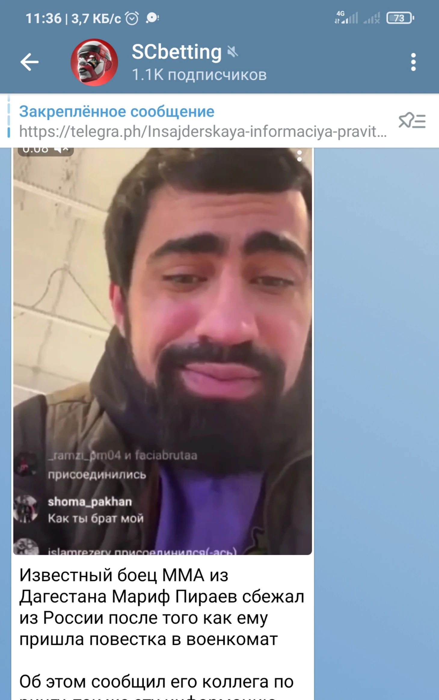 Известный боец ММА из Дагестана Мариф Пираев сбежал из России после того как ему пришла повестка в военкомат Об этом сообщил его коллега по рингу, так же эту информацию подтверждают спортивные медиа ресурсы. «Марифу повестка пришла… Мариф в ужасе соскочил с России», – рассказал другой боец смешанных единоборств Шамиль Галлимов во время прямого эфира в запрещенном в РФ Instagram. «Фара, когда война была… даже когда Азербайджан воевал, Фара не ездил, думаете сейчас газанет что ли?», - поделился он о намерениях ещё одного бойца, уроженца Саратова с азербайджанскими корнями Фарида Ядулаева.