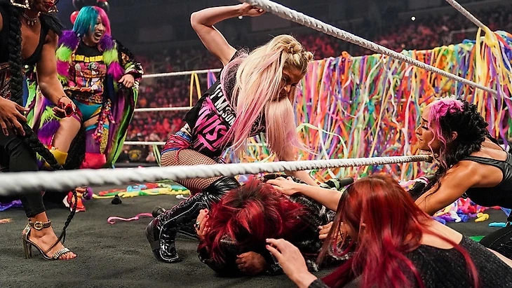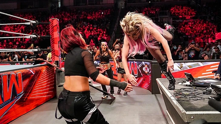 Такое неуважение Бьянка не потерпит, поэтому они с Алексой и Аской пришли преподать DC урок уважения. "Хорошие» девушки поднялись на ринг, а Бэйли не понравилось, что Бьянка такая нетерпеливая. Поэтому она и не контролирует ничего на RAW. Ей нужно быть как Бэйли - более терпеливой, играющей большую игру и пытающейся увидеть всю картину целиком. Плюс, Бэйли уже сказала, что в следующий раз они с Белэйр подерутся, когда Бэйли сочтет нужным, и это время еще не настало. А что тут делают Блисс и Аска? У «EST», вроде бы, достаточно украшений, зачем ей еще 2 безделушки? Блисс взяла микрофон, чтобы сказать, что Бэйли говорит, как будто она недосягаема, но если продолжит, то Аска и Бьянка станут украшением к тому, что Алекса сделает с Бэйли. Та ответила, что не ожидала услышать от Блисс такие «кусачие» слова, Бэйли думала, что кусается тут только единственная подруга Алексы кукла Лили. Тем не менее, в прошлом Блисс немало крови попила Бэйли. Благо, сейчас Бэйли ее не узнает, перед ней словно тень той самой Блисс. Алекса заявила, что что-то в ней с тех пор не поменялось: она с радостью поиздевается над Бэйли еще. Как на счет сегодня? Почему бы им не провести матч один на один? И, да, Лили кусается. Но и Блисс зубы еще не потеряла. Damage CTRL всем видом дали понять, что не относятся к этим словам серьезно, но когда их соперницы сделали шаг вперед, Бэйли и подруги попятились. Потенциальная претендентка на женское чемпионство RAW попыталась атаковать Алексу неожиданно, но нарвалась на удар предплечьем, и ИЙО с Дакотой пришлось срочно вытаскивать подруги из четырехугольника. Конец.