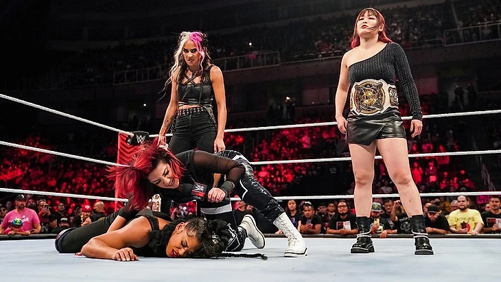 Девушки выехали на небольшой машине на арену, на ринге рассыпали конфетти в их честь, и все такое. Бэйли поздоровалась с Сан-Хосе, сказав, что к ним наконец приехал герой этого побережья. Она думала, что сегодня они смогут устроить домашний такой праздник в честь выигрыша командных титулов… и когда она говорит про «них», Бэйли имеет ввиду ни в коем случае не фанатов и своих земляков, а себя любимую, ИЙО и Дакоту. Зрители ответили неодобрительным гулом, что Бэйли не понравилось. Аудитории стоит проявить немного уважения по отношению к чемпионкам, тем более, что, раз Сан-Хосе Шаркс не смогли выиграть кубок Стэнли, других чемпионов у нас для вас нет. СКАЙ заявила, что теперь они держат RAW под контролем, за что поблагодарила Бэйли. Та сказала, что это она должна благодарить ИЙО и Дакоту, ведь они поверили в то видение, которое Бэйли им представила. «Мы были нужны друг другу» - добавила Кай, сказав, что женский дивизион в них нуждался. А вот в ком никто не нуждается, так это в Аске, Алексе Блисс и Бьянке Белэйр. Да, когда-то они были лицом дивизиона, но теперь Аска, Блисс и Белэйр не контролируют ничего. Аска когда-то была бесстрашным воином, Алекса себя теперь ведет, как будто ей провели лоботомию, а Бьянка так халявила последние 300 с лишним дней, что забыла, каково это, быть удержанной, пока Бэйли не напомнила «EST» об этом на Clash at the Castle. Теперь Блисс, Аске и Белэйр ничего не остается, кроме как собрать вещи и уехать домой. После этих слов на арене появились соперницы Damage CTRL по CatC. Белэйр сказала, что не хотела прерывать их изначально, все-таки надо было девушкам дать возможность отметить победу... но они снова открыли свой рот на чемпионку и ее подруг.