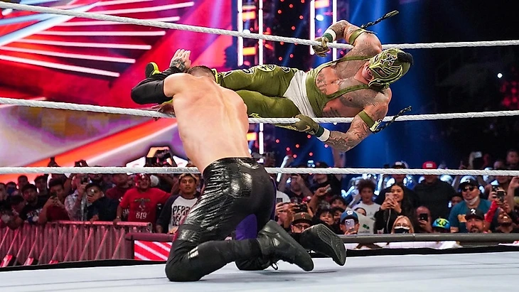 Вернувшись с рекламы, мы увидели, что JD все еще контролируют все, что происходит не только в ринге, но и за его пределами. Рипли, например, проведа Мэтту бэк суплекс на рингсайде, пока судью отвлекал Балор. Потерпев еще немного, Мэтт поймал Дэмиэна хай киком, «шлифанув» это дело своим Bro 2 Sleep, передав затем «горячий» тэг Рею. Прист сменился с Балором, и лучадор поймал его дропкиком в голову, провел энзигури с апрона и seated senton с угла. Бейсбол слайд Дэмиэну, и Финн воспользовался этим, чтобы нанести несколько ударов, и получить спрингборд кроссбади. От серии панчей в углу Балор отбился, попытался выйти на Reverse Bloody Sunday, но Рей реверсировал его и уложил «Принца» на второй канат под 619. Дэмиэн вытащил лучадора за пределы ринга, за что стал жетвой РК от Риддла, к которому прибавился спрингборд Floatin' Bro. Мистерио тем временем вышел-таки на 619. Остался только сплэш, но на апроне возникла фигура Рии. Рей отвелкся, судья отвлекся, а на Риддла со спины напал Сет Роллинс. Он хотел побить "Бро» стулом, но Мистерио вовремя это заметил, прибежал на выручку Мэтту и отобрал у «Архитектора» предмет мебели. Сет убежал через зрительский зал, а перед Реем возник Доминик, который встал на колени и предложил ударить себя стулом по лицу. Какое-то время отец подумал, но не стал ничего такого делать. По возвращении в четырехугольник, правда, его ждал Слингблэйд от Балора. Тэг Присту. South of Heaven! Тэг обратно Балору. Coup de Grace, и Judgement Day победили. Доминик отпраздновал победу со своей «новой семьей».