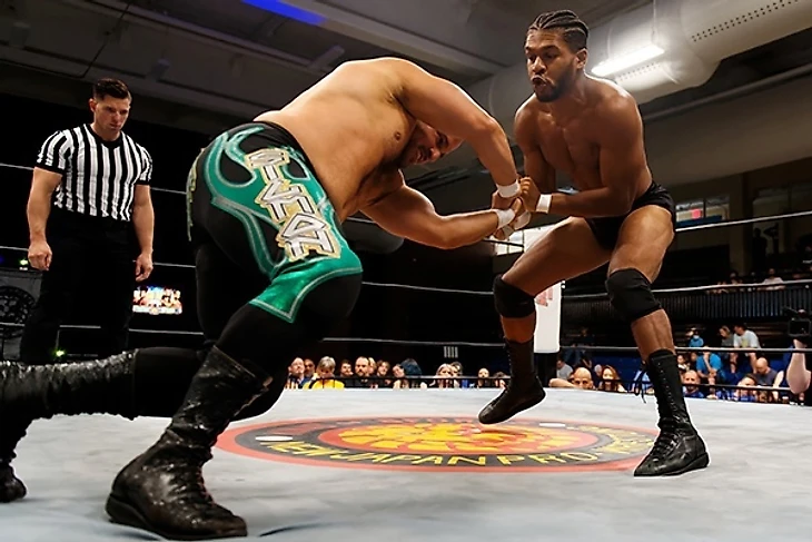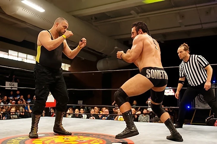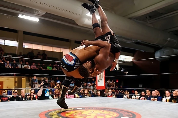 4) КУШИДА и Рен Нарита победили The WorkHorsemen (Энтони Генри и ДжейДи Дрейка). Последние являются одной из самых ярких команд инди-сцены, несмотря на довольно скромные достижения в титулах за 5 лет работы. Самыми заметными из них — командные чемпионства ныне покойного промоушена EVOLVE, благодаря которым команда заявила о себе во время своего противостояния с известной группировкой Catch Point. В рамках этого года команда отметилась серией выступлений в All Elite Wrestling. Правда матчи бывали довольно коротким и долгое время Генри с Дрейком проигрывали топ-звездам AEW. Хотя недавно они официально стали новыми подписантами промоушена и цикл их поражений был остановлен несколькими победами на выпусках Dark. Вне AEW у них ситуация куда лучше, ибо порой они побеждают довольно известных звёзд инди. Что до этого матча, то он образовался на почве вызова от Генри и Дрейка в сторону КУШИДы и Нариты, которых они и выбрали своими оппонентами для громкого дебюта в NJPW. Матч же стал по сути полноценной презентацией для тех, кому команда Генри и Дрейка сама по себе не была знакома в мейнстримном рестлинге (которые сейчас и составляют WWE, AEW и NJPW как ключевые флагманы последних 10 лет) — те уверенно составили конкуренцию из рандомной связки из агрессивного Нариты и миролюбивого, но не менее жёсткого Кушиды. Причём командная работа Генри и Дрейка тут была презентована хорошо по нарастающей: если по началу они выглядели несколько уныло и неинтересно, по ходу развития поединка The WorkHorsemen показывали отточенную командную химию и вполне себе атлетические навыки, не без опыта работы за последние 5 лет. Дрейк и вовсе показал себя способным броулером, несмотря на вид весёлого колобка + показал парочку реально весёлых моментов (особенно с мунсолтом, который не мог провести с третьего каната, но без проблем для себя пробил со второго). Плюс здесь гости из инди попортили кровь протеже Катсуйори Шибаты — я впервые увидел, как Нарита селлит кики ноунеймов, аж сам за сердце хватился из-за самочувствия Рена. Ну а Кушида был Кушидой, хотя и он показал парочку смешных попыток поднять массивного Дрейка на руки, что сработало лишь с третьей попытки и то не до конца. В общем команды выдали достойный мэйн-ивент и The WorkHorsemen показали себя исключительно с позитивной стороны, причём показали что они могут куда больше и что они заслуживают право на частные приглашения в NJPW. Победили КУШИДА и Нарита после Butterfly Underhook Suplex от первого на Энтони Генри (Личная оценка — 3,75).