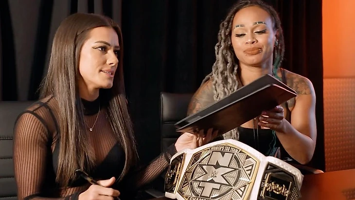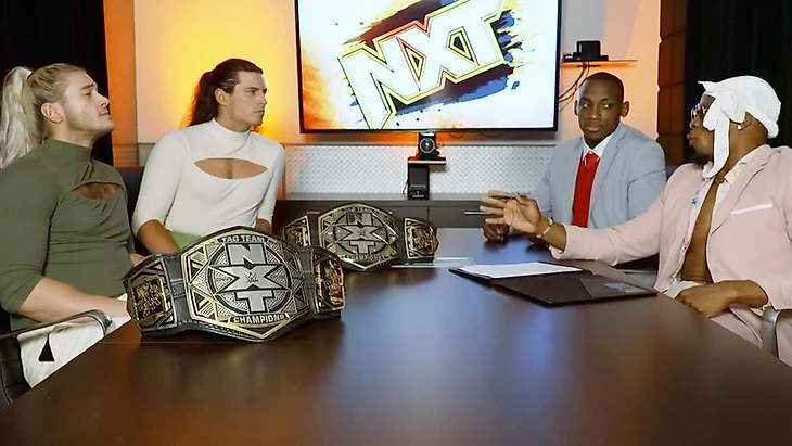 Нам показали промо-видео к матчу за женское командное чемпионство NXT между Катаной Ченс с Кэйден Картер и Никкитой Лайонс с Зойи Старк. Сегодня девушки подписали контракт на титульный матч, который пройдет на следующей неделе. Старк заявила, что они с Лайонс являются настоящей командой, что докажут на следующей неделе забрав титулы. Ченс ответила, что легко быть командой, когда вы побеждаете; посмотрим, что случится, когда Никкита и Зойи проиграют. «Пусть лучшая команда победит на следующей неделе» - подытожила Лайонс. «Да, и это мы» - ответила ей Картер. Не помню, когда в последний раз женским командным поясам уделяли столько внимания. Это определенно можно занести в заслуги новому руководству.