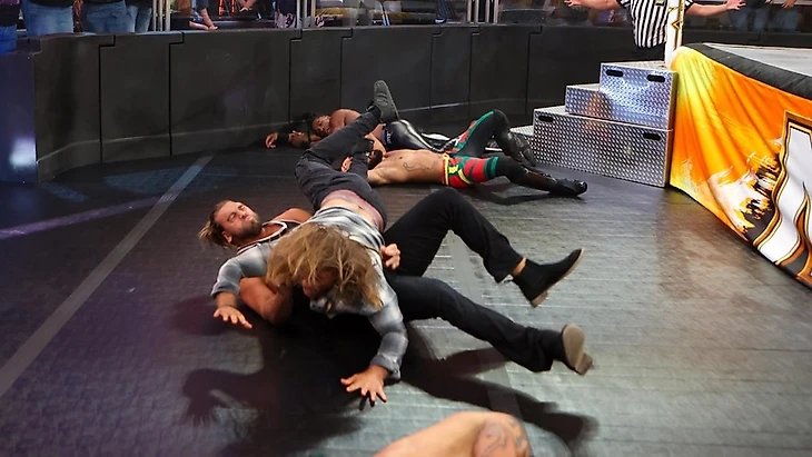 Так же коротко, как и женский матч до этого, но не так плохо, и эти 2 с небольшим минуты хоть сколько-нибудь напоминали рестлинг-матч. Тем не менее, я не понимаю, зачем в матче, где выступают 3 участника титульного матча на PLE и 1 «подсос», удерживают одного из участников титульника. Послематчевую атаку и появление остальных можно было обыграть и с победой Уэса и Оры. Ну и послематчевая мини-драка выглядела весело, но это слишком избитый способ WWE похайпить гиммиковый многосторонник на специальном шоу.