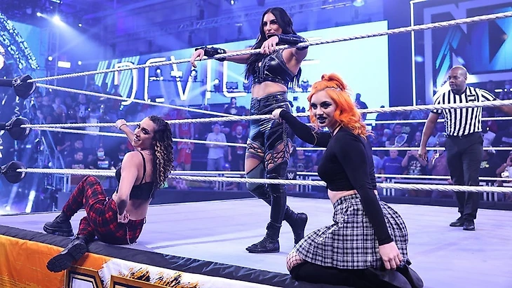Джиджи Долин и Джеси Джейн сопровождали Соню. Девилл начала довольно грязно и неуважительно работать, но Альба увернулась от всех серьезных ударов и провела хэдбатт. Чоп в углу, удар предплечьем в другом углу, и Девилл сорвала попытку полета со второго каната, добавив бут в голову до 2. Не успела Соня закрепить преимущество, а шотландка отбилась запуском в угол и лэриэтом. Серия ударов стали отличной почвой для фронт суплекса и РК, но восхождение на третий канат прервала Долин, возникшая на апроне. Файр вырубила ее, затем и Джейн, появившуюся тут же, чуть не провела Джеси Gory Bomb, но подругу спасла Джиджи. За это Альба подставила ее под биг бут Сони, и свернула Девилл до 3. Победа Файр. ТА попытались атаковать после матча, и у них это удалось за счет численного преимущества. Когда все трое держали Альбу, на арене появилась Мэнди Роуз. Чемпионка сказала, что похитить ее было неправильным решением. Файр получила свой титульный матч, но на Halloween Havoc Роуз будет вышибать клин клином, ну или бороться огнем с огнем, а мы увидим более жесткую ее версию. Пока Мэнди говорила, претендентка на ее пояс отбилась от тех, кто ее держал и нанесла по удару битой Соне и Джеси. Роуз хотела воспользоваться этим, поднялась в четырехугольник… но не успела нанести удар, и Альба прижала ее битой к канатам. Мэнди покинула ринг, оставив пояс, и Файр с ним даже попозировала.