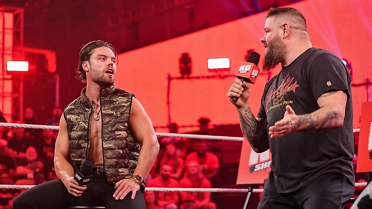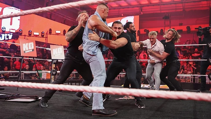 За кулисами происходило что-то отдаленно напоминающее вечеринку, когда Брукс Дженсен позвал всех смотреть KO Show, которое начнется прямо сейчас. Они с Джошем Бриггсом и Фэллон Хенли обсудили претендентов на чемпионство NXT и предложили сыграть в алкогольную игру: пить каждый раз, когда на экране происходит что-то глупое. Их внимательно слушали Инди Хартуэлл и Икемен Джиро. Мимо прошла, по-моему, Сол Рука на руках (no pun intended). Всех это удивило, а потом все воодушевились по поводу грядущей игры с алкашкой.