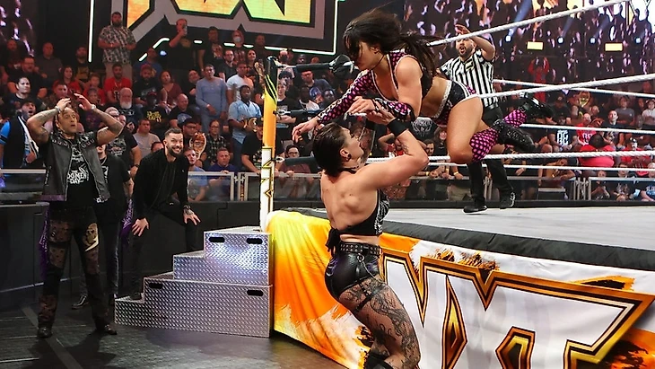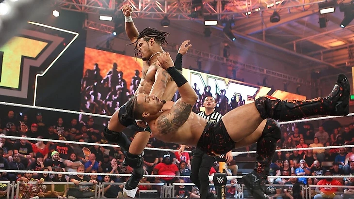Хороший открывающий матч, в котором все, если говорить только об этом конкретном поединке, было сделано правильно. Рипли не должна была проигрывать, но Перес показала характер. В поединке была буквально пара моментов с незначительным браком, но это не были жесткие ботчи, чтобы сильно заострять на них внимание. В общем, хороший матч с очевидным исходом. Но, я это скажу впервые, хотя обозреваю NXT уже какое-то время: я не понимаю, зачем было придумывать вот такой гиммик с матчами девушек NXT против представительниц основы перед PLE. Им, девушкам NXT, по идее нужно momentum набирать, а не проигрывать. При этом отмечу, что реализация этой, на мой взгляд, не самой понятной идеи, неплохая. Даже в соперницы Роксанне и Джэйд подобрали тех, кого фанаты NXT будут рады видеть. Но, опять же, в защиту этого решения можно сказать, что Рокси набрала столько momentum, сколько могла. Ну и здорово видеть Рипли в телевизионном матче впервые с начала июня.