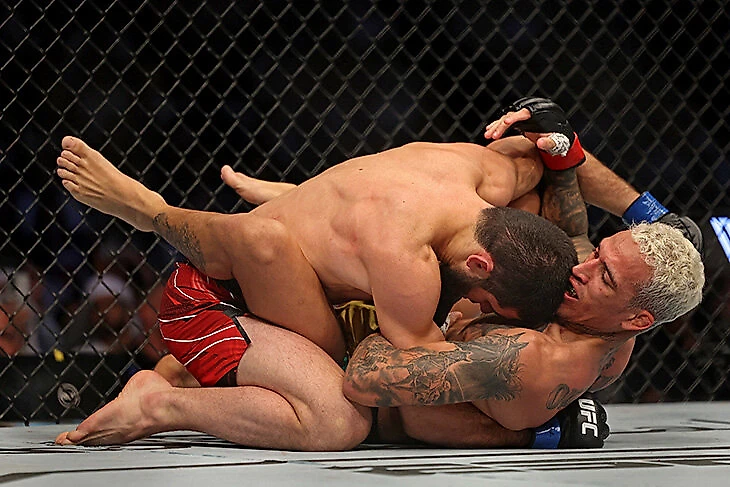 Оливейра – настоящий мастер джиу-джитсу. Он получил черный пояс еще в 2010 году, а в 2021-м проапгрейдил его до третьего дана. Именно Чарльз удерживает рекорд UFC по количеству побед сабмишенами: он сделал это уже 16 раз – из 21-й победы! Поэтому перед боем против Махачева большинство и задавалось вопросом: будет ли Ислам настолько внимательным, чтобы не зевнуть болевой или удушающий прием от Оливейры, который не боится оказываться на спине под соперником?