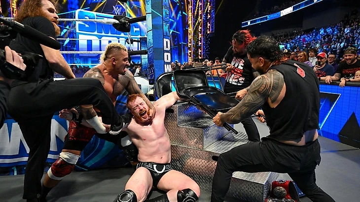 Восхождение на третий канат Соло прервал, снова атаковал травмированную руку и плечо визави, провел самоан дроп со второго каната, однако Шеймус вырвался! Заблокировав Uranage, лидер Brawling Brutes смог вернуться в поединок с помощью пауэрслэма, и соперник оказался на апроне, где его, конечно же, ждали Beats of Bodhran, причем не только в грудь, но и в другие части тела. Увернувшись от Brogue Kick, Сикоа провел thrust kick в голову, но Шеймус тут же шарахнул коронное колено в голову. Удержание рефери отсчитывать не стал, ибо был слишком увлечен лицезрением Сэми Зейна на апроне, которого оттуда стащил Усо. Тут же Джимми провел ему thrust kick в голову, но на него налетел Ридж. Холлэнду достался суперкик от Джея, и Риджа отправили в полет через комментаторский стол прямо к Бутчу, после чего Усо «похоронили» под комментаторским столом обоих. Шеймус, увидев это, провел командным чемпионам двойной клоузлайн с третьего каната, вернулся в четырехугольник, атаковал Соло, но на апроне ирландца за ногу схватил Зейн. Шеймус отбился, но Соло провел жесткий кик в травмированное плечо, а потом добил именитого оппонента победным Spinning Solo (uranage). Но победы Bloodline было мало, и они вместе побили Шеймуса за пределами ринга. Потом Сэм и оба Усо притазили стулья. Джимми зафиксировал руку ирландца в одном стуле, а Джей нанес несколько ударов другим. Bloodline торжествуют, а мы едем дальше.