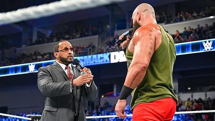 Брон вышел первым и предложил посмотреть на него. Его не так просто не заменить, да и найти Строумэна достаточно легко, если у тебя есть с ним проблемы. «Монстр» слышал, что ЭмВиПи наговорил много всякого на Monday Night RAW, поэтому почему бы им с Омосом не появиться прямо сейчас и не посмотреть Брону в глаза. Пи появился и предложил прояснить кое-что: никогда он не отказывал Строумэну в том, что тот является монстром, ведь это факт. Брон всегда был самым крупным и самым сильным. Это продолжалось до прошлой недели, пока Строумэн не оказался рядом с настоящим «Нигерийским гигантом» по имени Омосом. Брон представляет себя «главным монстром из всех монстров», и Вселенная WWE верит в это. И если Строумэн хочет сохранить эту ауру, ЭмВиПи советует ему держаться подальше от Омоса, ведь оказавшись рядом с настоящим гигантом, Брон обнажит свои недостатки. Строумэн сказал, что с него достаточно, он не нуждается в советах Монтела. Почему бы ЭмВиПи не передать своему гиганту, что если Омос так хочет показать, что Строумэн «обычный», пусть попробует это сделать на Crown Jewel. Пи переспросил, неужели это вызов. Брон подтвердил. ЭмВиПи принял его от имени Омоса, но решил предупредить, что когда на Crown Jewel Омос будет разбрасывать Строумэна по рингу… Брон прервал его, сказав, что все знают, Брон больший специалист по действиям а не по разговорам. И раз уж Строумэн видит тут одного Пи… Тот прервал здоровяка, ведь ЭмВиПи ни разу не сказал, что Омос не прибыл на шоу. Заиграла музыкальная тема, и на арене появился нигериец в костюме. Он поднялся на ринг, и они с Броном стали пожирать друг друга взглядами. Строумэн подошел максимально близко, что-то сказал, и Омос вытолкнул его из четырехугольника. ЭмВиПи посоветовал своему клиенту уйти, а «монстр» рассмеялся. Рестлеры обменялись несколькими фразами...