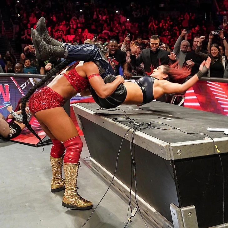 Тогда Бэйли потребовала разобрать комментаторский стол, но Бьянка отбилась от чего бы то ни было, атаковав не только Бэйли, но и СКАЙ с Кай. Бейсбол слайд «EST» реверсировала в пауэрбомбу на комментаторский стол, затем в стойку ринга, после чего отправила оппонентку лицом в апрон. Бэйли вернулась в ринг и отвлекла судью, а ИЙО запустила поясницей чемпионку RAW в комментаторский стол. Дакота добавила биг бут, и чемпионку закатили в ринг, что судья заметил… и вознамерился удалить Damage CTRL с рингсайда, но на девушек, а соответственно и на рефери с третьего каната хай кроссом полетела какая-то девушка. Бьянка заблокировала Rose Plant, провела KoD, но удержание отсчитывать было некому. Та девушка, что только что летала с третьего каната - это Никки Крос - запустила Бьянку в стойку ринга плечом, а потом провела коронный некбрейкер. На ринг выбежала другая рефери и отсчитала побеное удержание Бэйли. Примечательно, что, судья по всему, судья думала, что матч был титульный, попросив тайм-кипера передать пояс, который на саомм деле остался у Бьянки. А Никки атаковала еще и Бэйли. А потом сняла с себя куртку, побила еще и курткой Бэйли. В общем, Nikki stands tall, а шоу вышло из эфира.