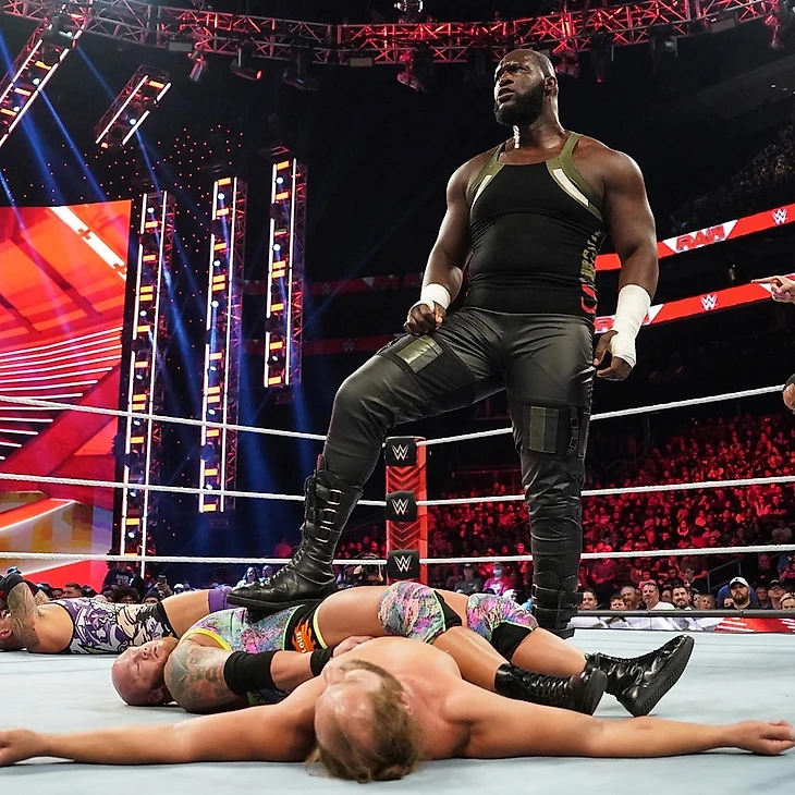 Перед матчем ЭмВиПи попросил минуту, чтобы напомнить, что на последнем SmackDown Омос и Брон Строумэн впервые сошлись лицом к лицу. И «так называемого» Монстра выкинули из ринга, словно ребенка. Строумэн считается одним из самых опасных людей в истории WWE, и если такое случилось с ним, то какие шансы у этих четырех джентльменов в ринге? Брону нравится говорить про «Get These Hands», но вы когда-нибудь видели руки, как у Омоса? Пи выразил надежду, что у людей в ринге есть страховка, а потом обратился к Строумэну. Монтел рассчитывает на то, что Брон смотрит сейчас RAW, ведь после Crown Jewel в WWE останется только один «монстр» - «нигерийский гигант» Омос. ЭмВиПи позвал рефери, и бой начался. Меньше чем через 2 минуты Омос уничтожил всех четверых. Они постарались как-то вместе забить его, но, понятное дело, ничего не вышло. Он провел пару бросков, кому-то досталась chokebomb, после чего Омос удержал двоих из четырех.