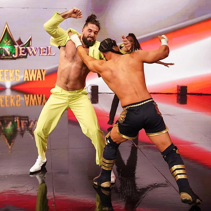 Али добавил флип сентон с третьего каната за пределы ринга, зашел на серию страйков по возвращении в четырехугольник, улучил момент для кика с апрона и коронного роллинг некбрейкера до 2. Суплекс Тиори заблокировал, провел бэк элбоу, но нарвался на thrust kick в голову. Tornado DDT от Мустафы, однако опять лишь до 2. Сплэш в 450 градусов цели не достиг, а еще один DDT Тиори заблокировал, проведя брэйнбастер на колено до 2. ATL Али заблокировал, провел бэкстэббер, и забрался на третий канат, но в четырехугольнике появился Сет Роллинс. Рефери отвлеклась на него, а Остин обрушил соперника на тернбакл, провел ATL и победил. Роллинс поздравил его с победой. Тиори ушел, а Сет остался на ринге с Мустафой, которого выбросил на рингсайд, сказав, что Али не заслуживает делить с ним ринг. Потом Роллинс закинул его в зону тайм-кипера, после чего направил в стену в зрительском зале. Сказав потенциальному претенденту, что ему не место в WWE Роллинса, Сет позвал охрану, чтобы Али выпроводили с арены и стал уходить, но на стэйдже Мустафа налетел на «Архитектора». Рестлеры сцепились в хоккейном клинче, Сет провел удар коленом в корпус, на что Мустафа запустил чемпиона головой в LED-экран. Роллинс ушел за кулисы, а рефери, коих на арене стало двое, пытались успокоить Али.