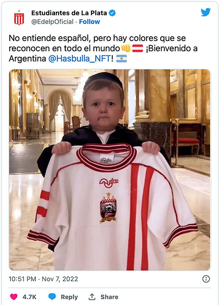 Но Хасбик до этого фотографировался в отеле и с формой «Эстудиантеса». Его твиттер гордо комментирует фото: «Он [Хасбик] не понимает по-испански, но есть цвета, признанные во всем мире».
