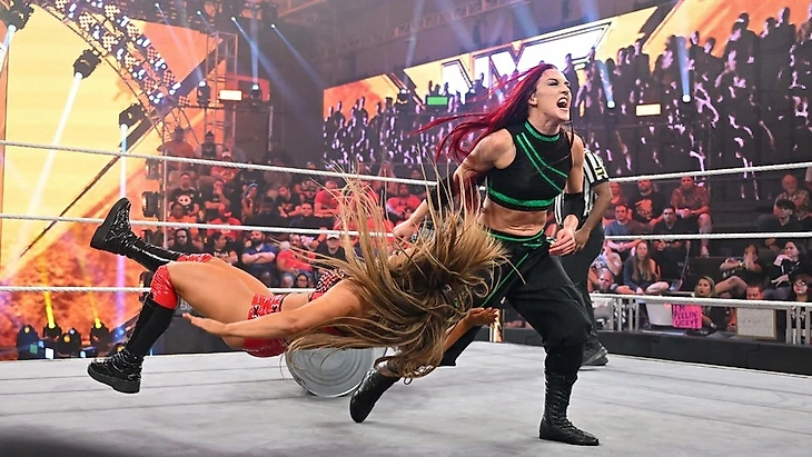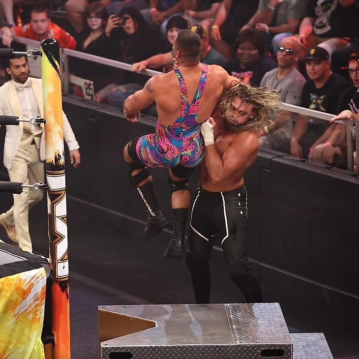 Файр с ним справилась, зарядила пару лэриэтов и фронт суплекс. Несколько киков в грудь, сплэш в углу, tornado DDT, и Мэнди вновь укатилась за пределы четырехугольника, где стала жертвой Swanton Bomb с третьего каната! Фанаты стали чантить «NXT!», судья открыл отсчет, и к 7 обе дамы поднялись. Альба вытащила из под ринга лестницу, ударила ей оппонентку, но запуск Роуз реверсировала. Еще один отсчет, и Мэнди еще и бросила лестницу сверху на претендентку, нанеся несколько ударов в грудь. На счет 8 Файр поднялась, и девушки вернулись в ринг, где Мэнди хотела что-то сделать, но получила спайнбастер на мусорный бак. На счет 5 Альба поднялась, а Роуз победила отсчет на 8, послав соперницу в полет через третий канат на рингсайд. Потом Роуз выкинула Альбу за ограждение, и тут оппонентки стал обмениваться ударами. Мэнди заблокировала суплекс с ограждения, отправив шотландку в полет куда-то в район ступенек, но Файр встала на счет 9. Роуз полетела на нее с баррикады, и влетела прямо в суперкик, получив еще и Gory Bomb на апрон. Зрители посчитали, что «This Is Awesome!», а Файр провела еще и удар битой по корпусу, установив лестницу рядом с комментаторским столом. Уложив Мэнди на стол, Альба забралась почти на самую верхушку, но за ее спиной появилась Айла Доун, прыснувшая чем-то в лицо Файр. Айла сбросила соотечественницу на комментаторский стол, с которого уже сползла Роуз. В итоге, стол развалился под Альбой, Мэнди поднялась на счет 9, а Файр так и не смогла этого сделать. У нас титульная защита. Роуз празднует, Доун счастлива, экраны на арене глитчуют, а шоу вышло из эфира.