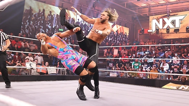 Слушайте, а это был крепкий матч для телевизионного выпуска, и даже тот факт, что в нем участвовал Вон Вагнер не сделал его плохим (хотя, возможно, я слишком предвзят в его отношении, и Вон не так уж безнадежен). То есть, нормальный такой матч на 10 с небольшим минут, в котором борцы показали то, что можно назвать рестлингом. Да, не «бэнгер», но вполне себе рестлинг-матч. Хотя, конечно, если задуматься о том, что это чемпионство NXT, вспомнить предыдущих чемпионов NXT и титульные защиты на «тех самых еженедельниках», то появится какая-то грусть. Ну да ладно. В любом случае, я вам скажу, что от матча Вон Вагнер - Брон Брейккер можно было ожидать намного меньше. Эти парни не сильно больше года назад начали получать телевизионное время, то есть, они еще достаточно зеленые. Брон ожидаемо защитился, Вона показали более-менее опасным соперником и проверили, способен ли он справляться с важными поединками, в итоге, выиграли все. Жаловаться не на что.