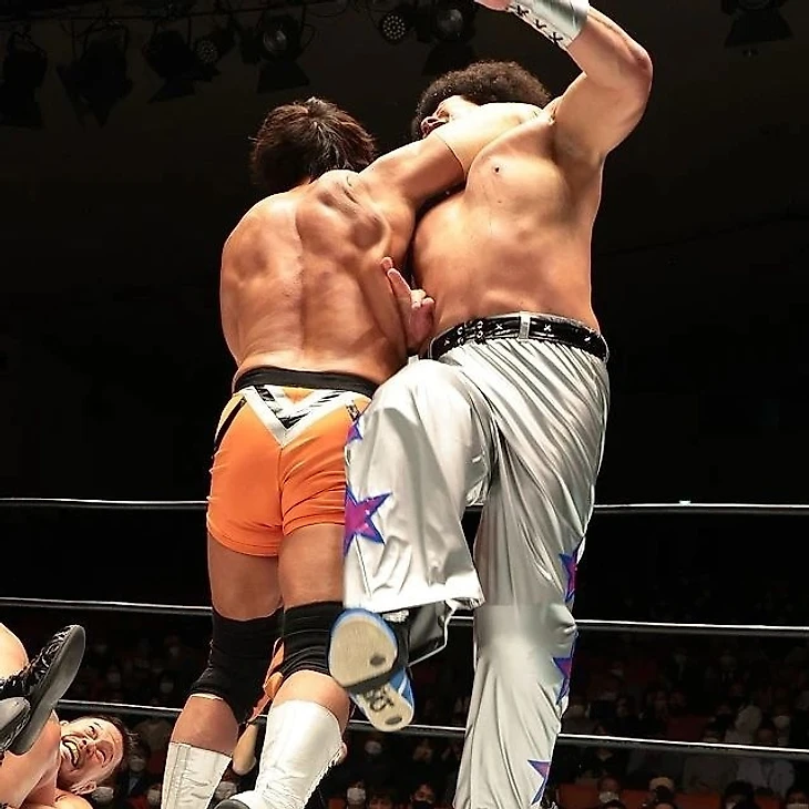 3) Dangerous Detectives (Такаши Сугиура и Сатоши Коджима) победили Funky Express (Мохаммед Йоне и Акитоши Сайто), защитив командные чемпионства GHC (в тяжёлом весе). Забег Коджимы в NOAH послужил ему в целом хорошую службу, так как он от лица NJPW получил довольно быстрый подъём вверх, хотя NOAH за последние пару лет успели немало закоренелых ветеранов пуроресу внезапно пропушить – самым ярким в этом отношении является легенда ММА-промоушена Pride и один из самых преданных последователей «инокизма» Казуюки Фуджита. Ну и Казуши Сакураба, ещё один яркий представитель промоушена Pride и NJPW времён 00-х годов, также не остался без такового внимания, не говоря уже про Масакатсу Фунаки, одного из основателей шут-стайла и промоушена Pancrase. Но если же о Коджиме, то 2022 год стал для него вторым пришествием – взятие главного чемпионства GHC в тяжёлом весе на CyberFight Festival II, результативный забег в главном турнире N-1 Victory 2022 (пусть и с проигрышем, но с 8 очками и победами над Фунаки и Масой Китамией). И наконец образование отдельной команды с лидером собственной «Армии» в NOAH, Такаши Сугиуры, с которым Сатоши успел пересечься в командных матчах до начала турнира, а на самом турнире, на 1-ом дне, оба устроили друг другу красочное столкновение и борьбу стилей «NJPW vs NOAH». Победил тогда Сугиура, но и Коджима от этого ничего потерял. Потому что Такаши решил скорешиться с ним и узнать как это работать с ним в одной команде. Сатоши ответил взаимостью и результат принёс свои первые плоды + оба почувствовали между собой особую химию (и где-то начал грустить Казуши Сакураба – с мыслями «как он мог променять меня, МЕНЯ, на Доктора Хлебных Наук»?). Это не оставили без внимания самые дерзкие представители Sugiura-gun – командные чемпионы GHC в тяжёлом весе, Хидеки Сузуки и Тимоти Тэтчер.
