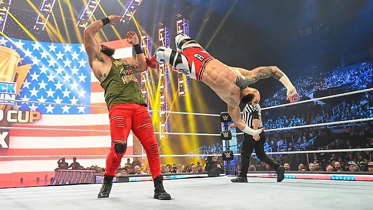 3) Рикошет победил Брона Строумена во 2-ом раунде и полуфинале турнира Smackdown's World Cup. Помимо побед в 1-ом раунде над Мустафой Али и Джиндером Махалом, оба попали на радар Imperium, причём Гюнтеру хочется быстро расправится с Рикошетом, ставя на его победу, а вот со Строуменом у ИК-чемпиона возникли нешуточные траблы. Плюс история вокруг Строумена и его твитов про хайфлаеров стала уже сюжетным моментом, несмотря на реальность инцилента с этими словами про «бездушных попрыгунчиков». Хоть матч и продлился меньше 4 минут, но в целом было ясно что Строумену не дали бы засквошить Рикошета в любом случае, причём выстроили матч хоть и паритетом для обоих, но в пользу Рикошета по сюжетному моментуму. Причём удивил то как обставили результат — несмотря на косвенное нефизическое вмешательство от Imperium, Рикошет победил чисто после Crucfix Bomb, будто проведя Zig-Zag Дольфа Зигглера (Личная оценка — 2). После матча Imperium атаковали скопом Строумена, давая Гюнтеру возможность реабилитироваться после прошлой недели. Но Брону на помощь пришёл именно Рикошет, так как понимал что числа не на стороне Строумена. Хоть атака Рикошета на всех не возымела эффекта, однако дала Строумену быстро прийти в себя и припугнуть имперцев, воздержать их от глупостей. А потом Брон помог Рикошету встать и признал его победу в матче (Я удивлюсь тому, если Рико и Брона в команду объединят такими темпами. А в целом — довольно грамотное наказание для Брона из-за его строптивого языка, но этого всё равно мало, учитывая что даже так ему сохраняют статусное положение. Причём уже дают пространство для титульного боя против Гюнтера за ИК-чемпионство, несмотря на вылет из турнира. Я уверен что только после деклассирования руками Гюнтера, Строумен отработает свой штрафбат и вернётся в строй в ряды апперкардеров ростера);