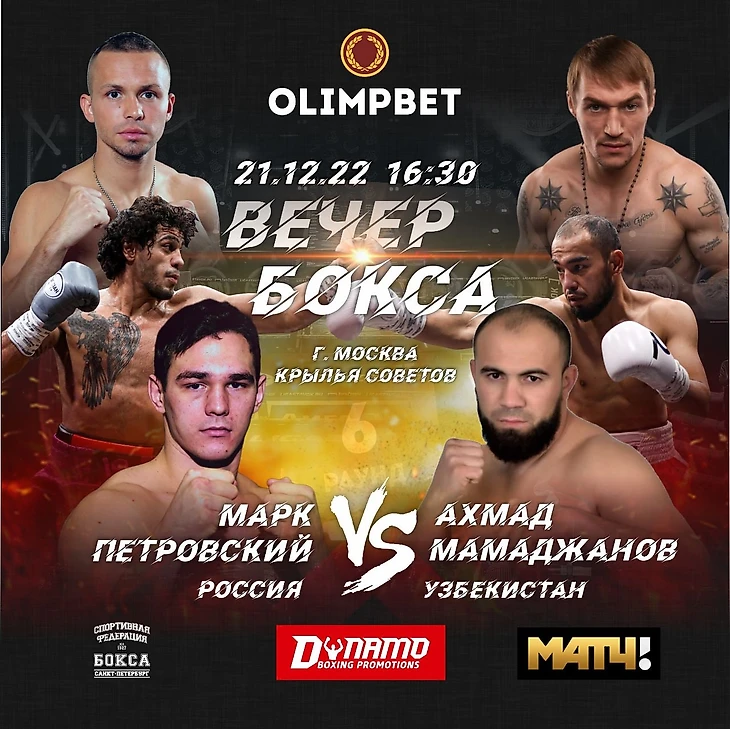 Чемпион мира-2021 россиянин Марк Петровский (1-0) 21 декабря в Москве проведет свой второй бой на профессиональном ринге. Соперником нашего титулованного боксера по шестираундовому поединку станет Ахмад Мамаджанов (3-3-1, КО 3) из Узбекистана. Об этом телеканалу UDAR рассказали организаторы.