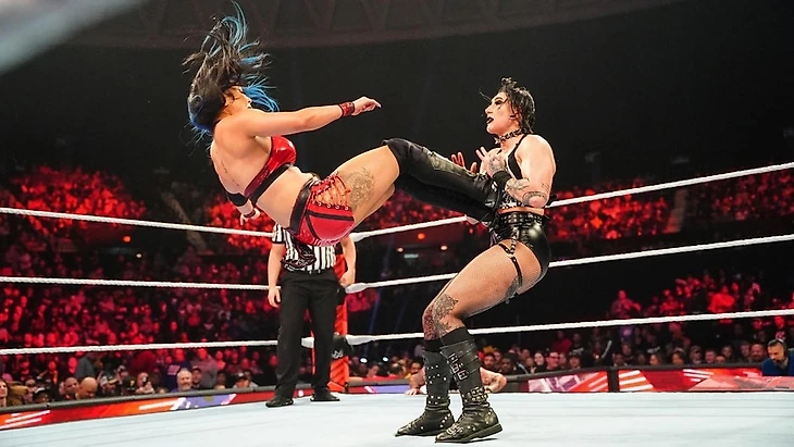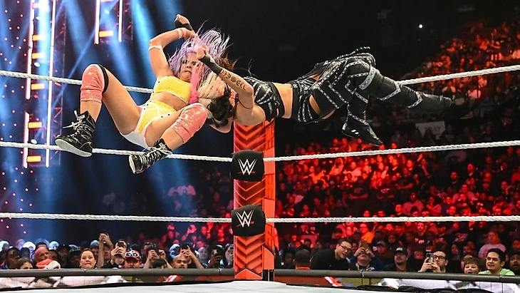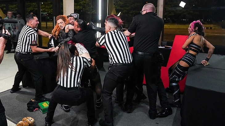 – Выпуск открыла Бекки Линч. Она снова вернулась к своему образу The Man, даже поприветствовала зрителей шоу своей фирменной фразой, однако после слов о том, что она соскучилась по этому ощущению приветствия фанатов на шоу... пошла к зрителям с микрофоном и принялась общаться с людьми, спрашивая их имена. Попутно она обсуждала своё возвращение на Военные Игры и то что это было особое ощущение, по сути повторив суть мыслей с последней пресс-конференции. Но тут же появилась Бэйли, причём сразу после упоминания от Линч про Damage CTRL. Бэйли тут принялась пытаться говорить с Бекки, затыкая зрителей, причём Линч осталась на месте на лестнице в зале арены, пока Бэйли жаловалась на несправедливое к себе отношение на ринге. Причём в перепалке прилетело фанату по имени Боб, хотя он точно не был расстроен этим... ибо и Бекки его защитила от нападок Бэйли, да и ему было приятно побывать в центре внимания, даже дав команду вернуться в ринг для взбучки для Бэйли. Однако этого не случилось из-за нападения с лестницы от Кай и Скай, куда потом подключилась и Бэйли после своих жалоб о том, что Линч словила лавры людей, которые не поняли что и она рисковала не меньше Бекки. А драка быстро перетекла в проходную арены, где также были фанаты. Основная драка была именно между бывшими Всадницами WWE, которых с трудом разняли охранники арены (Довольно нестандартное открытие шоу, учитывая что такое если и бывало раньше, то так редко, что и вспомнить сейчас никто не сможет. А про то что у Линч и Бэйли может быть фьюд – ну тут не было откровения, потому что всё-таки именно Damage CTRL вывели Бекки из противостояния группировки с Бьянкой Белэйр. И судя по всему только оно покажет кто может в будущем претендовать на главное золото бренда, снова, учитывая что обе прошли через противостояния с Белэйр. Начало истории в целом перспективное, точнее жаркое);