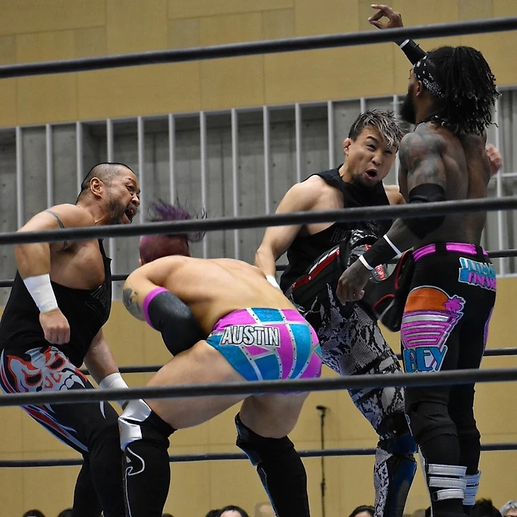 Начинают матч Йо и Кушида. Стартовый чейн рестлинг никому преимущества не дал, смена на Найта и Лио. Раш явно обгоняет молодого Найта, но тот его перехитрил и вкатил очень жёсткий слайдинг элбоу. Командная работа от Найта и Кушиды. Йо пытается ему помочь, но лишь выхватывает у обоих соперников. Рашу же это даёт достаточно времени, чтобы прийти в себя и отбиться от соперников. Смена, командная от хаоса. Отбивается от Йо Найт бэкбрэйкером, смена на Кушиду, атакует Кушида руку Йо, слепой тэг от Лио, попытка атаки сбоку от Лио, реверсирует его Кушида колесом в дропкик. Попытка сворачивания от Раша, армбар от Кушиды. Выкидывает Кушида за ринг Раша, но прямиком в Найта. Возвращается в ринг Раш, скулбой кик, попытка командного финишера от Йо и Лио, не проходит, Пеле кик от Кушиды Рашу, Найт получает от Йо, сносят друг друга. Попытка командного финишера Найта и Кушиды, не проходит, выносит с ринга Йо Найта, Асаи мунсолт от Раша, выносят они вместе Кушиду, суперкик от Йо Найту, последний час от Раша, до трёх.