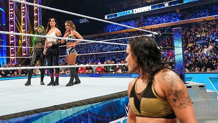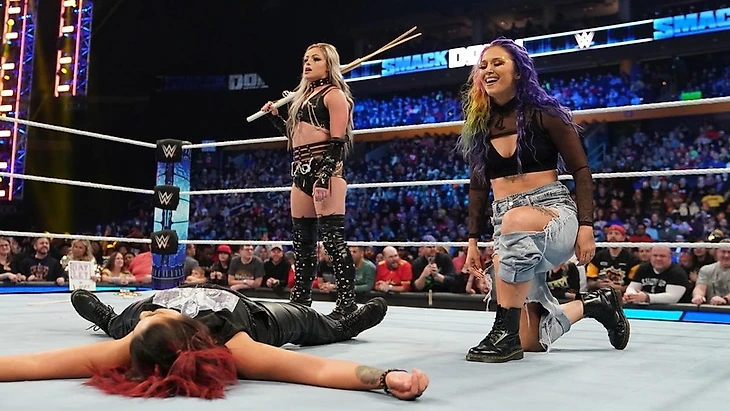 – Сегмент с Damage CTRL. Основное слово взяла Бэйли, успев оскорбить парочку фанатов за трибунами, плюс пожурить Майкла Коула, что мол он успел соскучиться по Бэйли. Да и кто будет поднимать рейтинги Смэка, если не она с со своими девочками. Но основной посыл был в сторону Бекки Линч, говоря что мол они трое провели чуть ли не полтора часа в самом страшном матче, женские Военные Игры, и сделали куда больше в нём, чем вернувшейся Бекки Линч, не понимая что она вообще ничем не рисковала. А вот Damage CTRL получили куда больше урона, но кто это будет уважать? Ведь всем нужно быть в восторге от того, как вернулась Бекки Линч после страшной травмы и потратила своё время, которого достаточно для того... чтоб утром себе чашку кофе сделать. Плюс она возмущена тем, что в женском дивизионе синего бренда более не найдётся той, кто решится бросить вызов самой длительной женской чемпионке в истории Smackdown. Поэтому ей стыдно за то, что люди не понимают – именно Damage CTRL тут в роли моделей для подражания. Здесь ей перебила Лив Морган, говоря что она решила найти себе проблем на синем бренде – значит Лив станет первой проблелой Бэйли. И даже численное преимущество не смутило Лив... которая пошла в атаку на Damage CTRL, предусмотрительно нейтрализовав Дакоту Кай и Ийо Скай с ринга. Правда драка 1 на 1 не получилась, ибо Дакота и Ийо быстро вернулись и спасли Бэйли от рук Морган. Но тут на помощь самой Лив... явилась Тиган Нокс, которая официально вернулась в WWE и в обновлённом внешнем виде. Ей удалось отвлечь на себя внимание всей троицы, а Лив вернулась в ринге с кендо-стиком в руках, успев его сломать об Бэйли. Закончилось все Shiniest Wizard от Нокс на Бэйли (правда чуток забракованным) и Damage CTRL покинули ринг в гневе от драки (Вот Игрок и собрал своё любимое женское трио в основе — Кай, Нокс и ЛеРэй, ибо верит в силу женской дружбы. А сегмент выдался весёлым, пусть у Бэйли и были по ходу него и были проблемы с логичностью своих высказываний, но это и дало свой забавный эффект, тем более на контрасте с выходом к ним Морган, показавшей тактическую смекалку в драке. И да — учитывая ранее указанный момент с тем самым женским трио... я не удивлюсь тому, если именно ЛеРэй и Нокс станут причиной распада Damage CTRL, заставив Дакоту Кай вспомнить былые времена в NXT до её хилтёрна на Нокс в 2019 году);