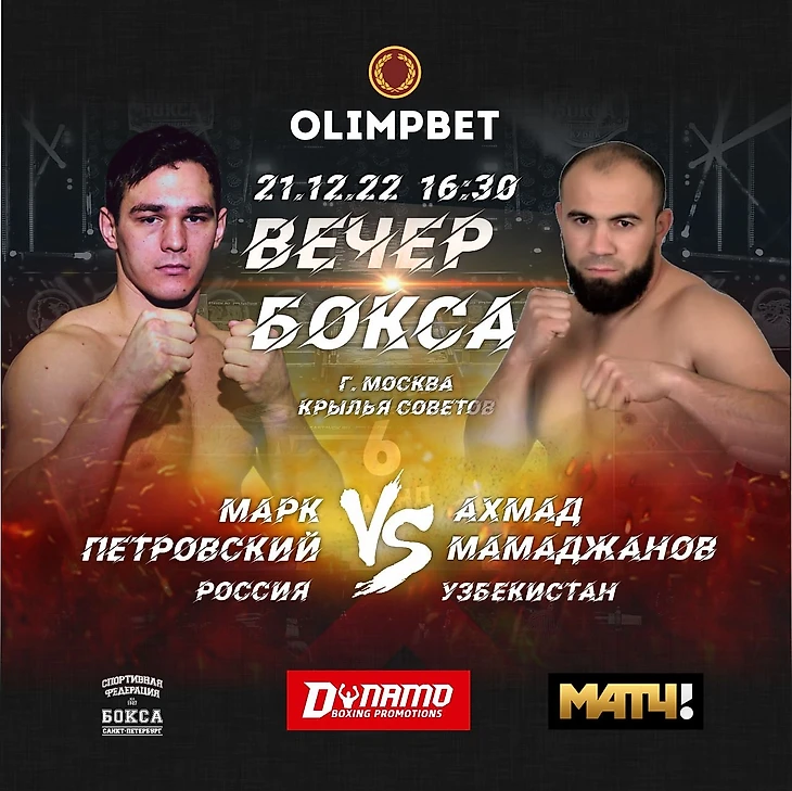 Этот бой возглавит турнир в УСК «Крылья Советов», который будет организован промоутерской компанией Dynamo Boxing Promotions совместно со Спортивной Федерацией бокса Санкт-Петербурга при поддержке Федерации бокса России. Генеральным партнером вечера бокса 21 декабря выступит букмекерская компания OLIMPBET.