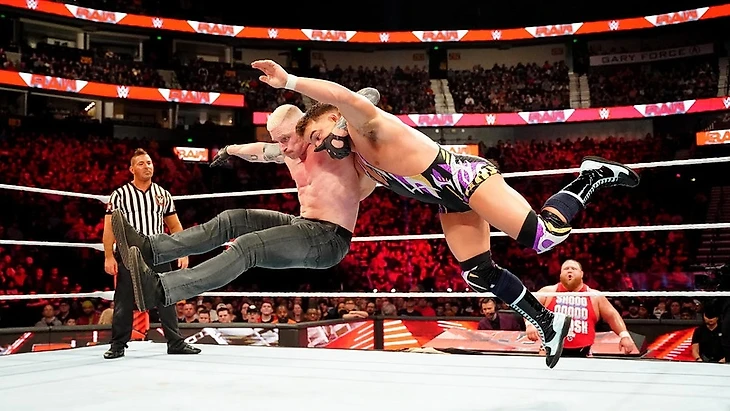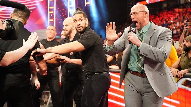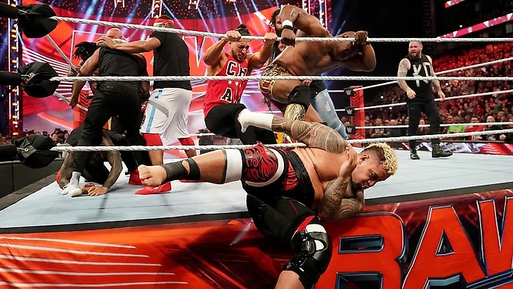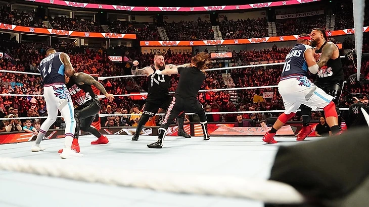 Но за его спиной возник Алам Пирс с толпой охранников. Адам остановил Кевина, а потом сказал, что на RAW решают все не Bloodline, а, собственно, Пирс. Он итак слишком много позволил Bloodline, включая Романа Рейнса. Поэтому ни сегодня, ни вообще в этом году таких вот «захватов» шоу больше не будет. Вместо этого Адам потребовал, чтобы Усо, Сикоа и Зейн мирно покинули сначала ринг, а потом и арену. Охрана их проводит. Охранники стали по одному подниматься в четырехугольник, и всех их по очереди вырубил Соло. Оуэнс посмотрел на все это и направился в ринг. Он отвесил несколько ударов, наверное, каждому из Bloodline, но численный перевес взял свое. Тогда Пирс позвал всю раздевалку RAW. Выбежали Люк Гэллоуз (а значит его вмешательств в матче за чемпионство NEVER на Wrestle Kingdom точно можно не ждать), Элайас, Шелтон Бенджамин, Седрик Александр, Street Profits, Мустафа Али. Толпа смогла очистить ринг от «захватчиков», и они стали покидать арену через зрительский зал, но Пирс, поднявшийся в четырехугольник, заявил, что так просто Bloodline не сбежать. Они решили поработать? Адам найдет им работу. Каждый из них сегодня получит матч, и это официальное заявление.