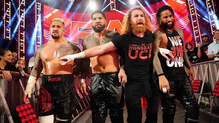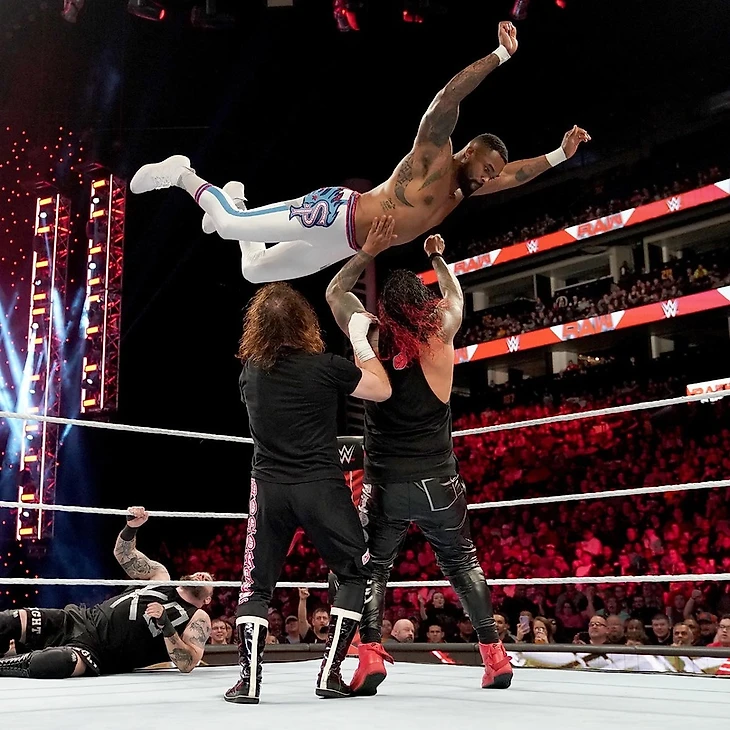 Bloodline вышли первыми. Оуэнс и SP быстро поднялись в четырехугольник за ними и устроили большую драку. Эта самая драка перетекла за пределы ринга, проходя при полном доминировании хороших ребят. Затем Анджело загнал Джимми в четырехугольник, и матч официально стартовал. Пережив стартовый натиск, Усо провел шоулдер тэкл, но довольно быстро получил бэк элбоу и спиннинг лэриэт в углу. Энзигури от Анджело до 2, и SP сменились, чтобыв провести командную работу. Еще один тэг, и Джимми сумел прервать поытку атаки, и, пока рефери не видел, Джей провел кик в спину Анджело, тут же заменив брата в четырехугольнике. Джей провел серию стомпов, передал тэг Усо, и Bloodline начали развивать инициативу, часто меняя друг друга в ринге. В какой-то момент «ЭйДи» отбился от Джея панчем, передав право ведения боя Оуэнсу. Тот провел серию страйков и сентон Джею, вырубил Джимми на апроне и показал Зейну, не желавшему контактировать с бывшим другом неприличный жест. Затем «КейОу» хотел смениться с Тезом, но тот слишком переживал о том, что случилось с Белэйр, так что не среагировал нормально, и Джей направил Кева в свой угол, и Bloodline начали забивать бывшего чемпиона мира. Так шоу и ушло на рекламу. Когда пауза завершилась, Оуэнс попытался отбиться от Джимми, но получил по лицу. Тэг Джею, и тот продолжил издевательства над канадцем. попутно вырубив на апроне Докинса своим thrust kick. Усо так увлекся тем, что смотрел на Анджело, что «проспал» thrust kick в голову от Кевина. Передать тэг Оуэнс мог только Форду, что и сделал, хотя Монтез был морально не готов.