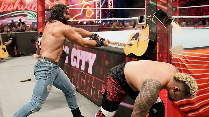 Суть матча вы улавливаете: уличная драка, но в роли оружия здесь выступают музыкальные инструменты. Матч начался с безрезультатного лок-апа. Затем Элайас применил хэдлок, но шоулдер тэкл самоанец просто «впитал», доведя оппонента до угла, где провел жесткий панч. Сикоа провел еще несколько ударов, потом придушил визави. и тот стал отвечать жесткими чопами. Рестлеры по очереди заблокировали попытки хип тосса, и Соло провел лэриэт. Еще пара ударов, и Элайас оправил его за пределы ринга, но промазал бейсбол слайдом, получив еще один удар по лицу. Соло решил воспользоваться первым оружием - колоколом, но Элайас «ожил»,нанес пару ударов и зарядил колоколом по спине. Побив недруга у стойки ринга, Элайас собрался провести удар гитарой, но Сикоа увернулся, попытался перехватить контроль, однако был запущен в барабанную установку. Удар стойкой с тарелками отправил Соло в зону тайм-кипера, а шоу на рекламу. Вернувшись с паузы, мы увидели, что Элайас ударом кейсом гитары по спине загнал врага на стэйдж. Тут Соло реверсировал запуск в кабинет (колонку), добавив пару ударовмикрофоном в голову. Thrust kick в голову последовал, и Элайас улетел в барабанную установку. Соло провел пару ударов стойкой для барабанных тарелок, провел хэдбатт, и так рестлеры вернулись на ринг, где Элайас атаковал Сикоа клавиатурой, за что получил самоан дроп до 2.