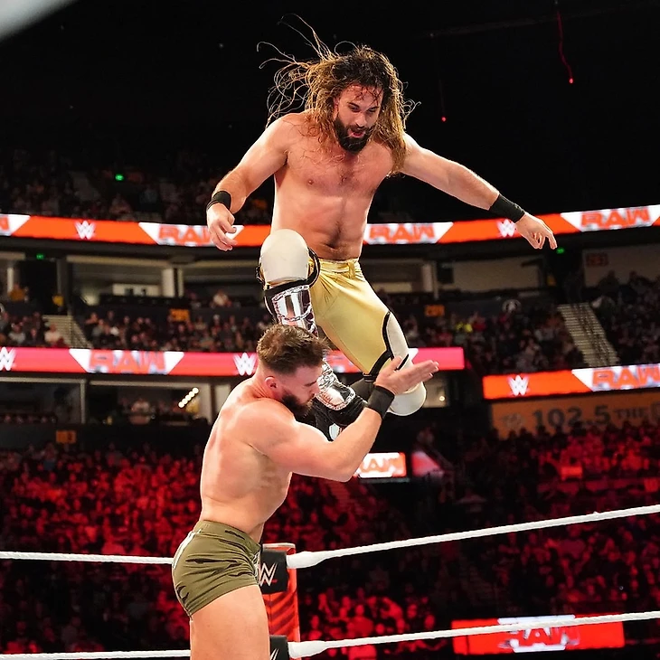 Шоу вновь ушло на рекламу. очевидно, последнюю на сегодня. После нее мы увидели, что Роллинс разозлился на бывшего протеже, нанес несколько уддаров, провел пару лэриэтов, несколько киков, еще один удар, который отправил Тиори за пределы ринга. Суисайд дайв от Сета, действо вернулось в четырехугольник, и Тиори реверсировал Pedigree, попав в сворачивание до 2. Серия реверсов привела к бэкбрейкеру от Сета до 2. Претендент стал забираться на третий канат, но Остин прервал это восхождение… Роллинс попытался «взорваться» бакл бомбой и серия реверсов привела к сворачиванию от Сета до 2, посе чего он не сумел провести бакл бомбу, и, видимо, повредил ногу в этом эпизоде. Тиори решил провести собственную бакл бомбу, и рестлеры стали бороться за контроль, что привело чемпиона на третий канат. Он вырубил соперника, но Роллинс тут же запрыгнул обратно, чтобы провести суперплекс! Попытку фэлкон эрроу Тиори реверсировал в брэйнбастер на колено, однако Роллинс вырвался на счет 2! Борцы немного перевели дух, Тиори попытался выйти на ATL, Роллинс заблокировал, соперники обменялись киками, и снова упали без сил.