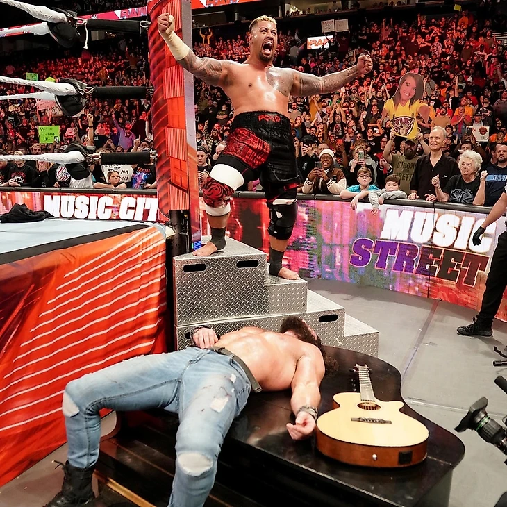 Элайас, как всегда сидел в центре ринга с гитарой, Он представился, поиграл чуть-чуть на музыкальном инструменте, и сказал, что мы в «музыкальном городе» Нашвилле, и сегодня Элайас планирует разбить эту гитару о голову Соло Сикоа в Music City Street Fight. Сегодня Сикоа узнает вселенскую правду, которую знает каждый в толпе и даже Харди. Да, WWE Stands for WALK WITH ELIAS. Рестлер прибыл сегодня подготовленным: он написал небольшую песенку, которая поможет всем настроиться на бой. Он попросил зрителей начать хлопать, сам начал играть, но появление Соло его прервало.