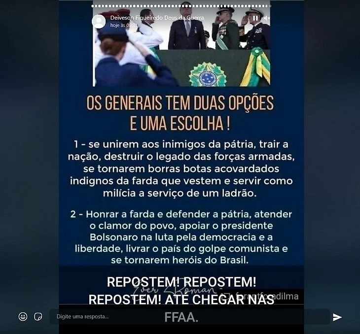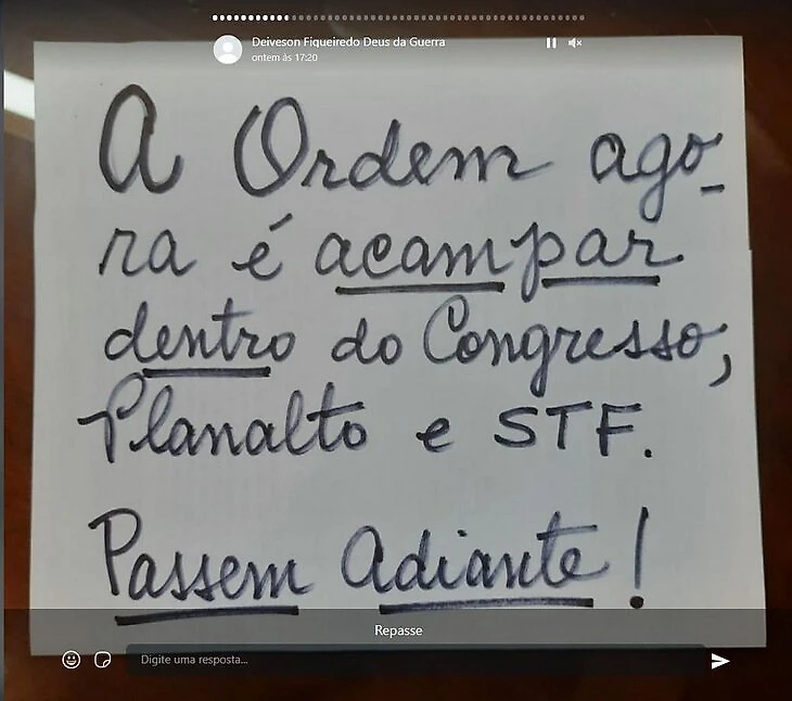 На другой фотографии Фигейредо в вотсапе изображен лист бумаги с надписью: «Нужно разбить лагерь внутри конгресса, Планалто [президентская резиденция] и STF [верховный суд Бразилии]». В длинном сообщении с фотографией Болсонару, которому салютуют военные, говорится:
