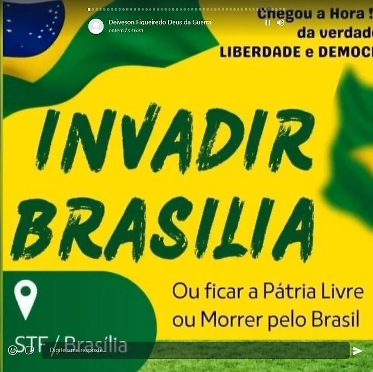 Когда сторонники Болсонару вторглись в здание конгресса в Бразилиа, Фигейредо поделился серией фотографий в вотсапе. Многие из них сопровождались лозунгами протестующих. Среди них – прямой призыв: «Вторгнуться в Бразилиа. Либо у нас останется свободная страна, либо мы погибнем за Бразилию».