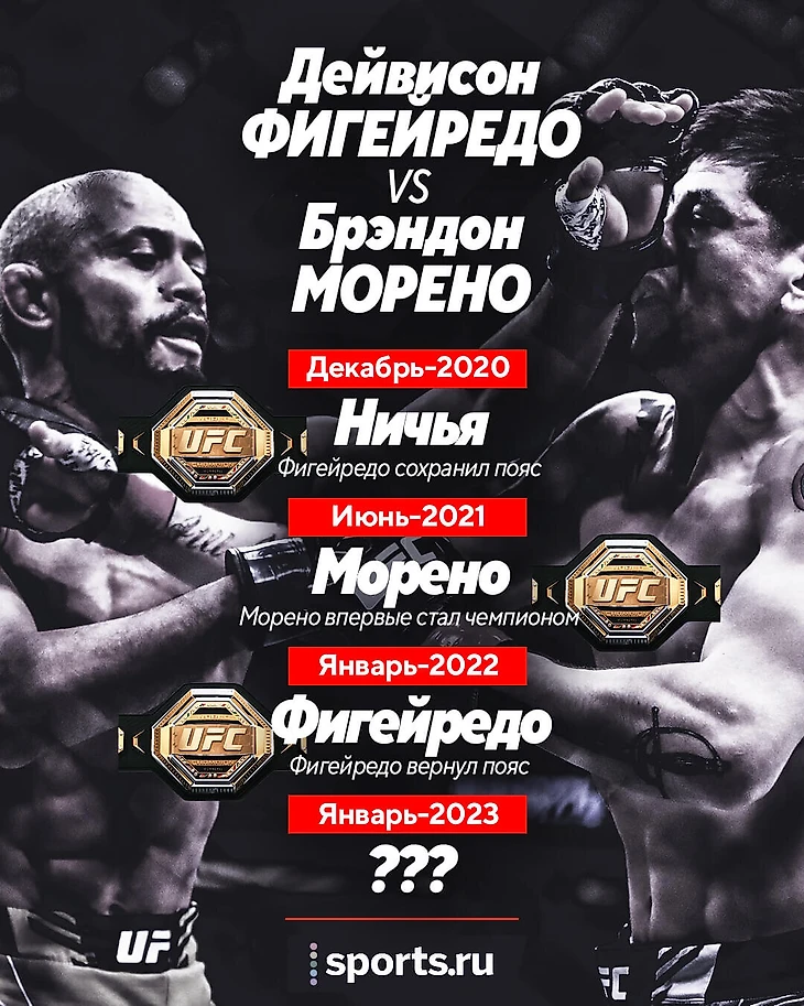 Теперь Фигейредо и Морено делают историю: чемпион и временный чемпион подерутся в четвертый раз – такого в UFC не было никогда. Все три боя они провели в США, но теперь встретятся в Бразилии.