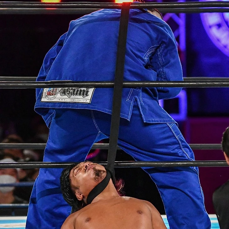 Пошли размены ударами коленями, забивает соперника О-Хан. Бросок через плечо, лариат от Такаги, снимает он Ги, не понимаю, почему он ещё не дисквалифицирован, раз он должен носить Ги по условиям матча, в любом случае ДДТ, слайдинг лариат, серия ударов в полном маунте, треугольник руками. Развязался Ги и у О-Хана. Отличный бросок от О-Хана, подсечка под ближнюю ногу, вернулись в стойку, задняя подножка, треугольник руками от О-Хана, к канатам. Душит своим Ги О-Хан Такаги, все по правилам, О-Хан говорил, что так можно, Акира зачем-то полез в ринг, когда О-Хан стал душить Такаги поясом, О-Хан буквально повесил Такаги на поясе, Оскаттер за пределами ринга. Ещё один бросок от О-Хана, на 9 встаёт Такаги. Броски через плечо, контрил Такаги это слипером, О-Хан своим, падает с ним Такаги, ни дроп от него же, попытка рюкон лариата, слипер от О-Хана, lust of the dragon! Встаёт О-Хан! Пампинг бомбер, классический удушающий из дзюдо, даже захват не за шею, а за куртку О-Хана, О-Хан теряет сознание!!!